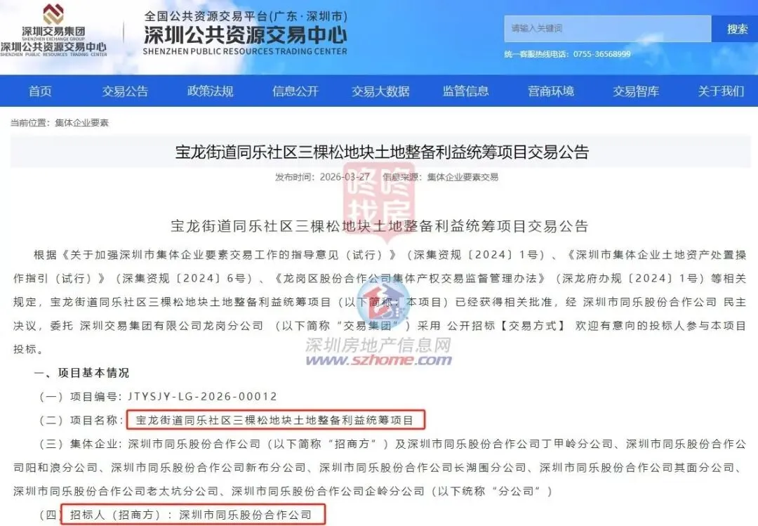 3月27日,宝龙街道三棵松地块土地整备利益统筹项目对外进行合作方公开交易招标,招标人为深圳市同乐股份合作公司。
