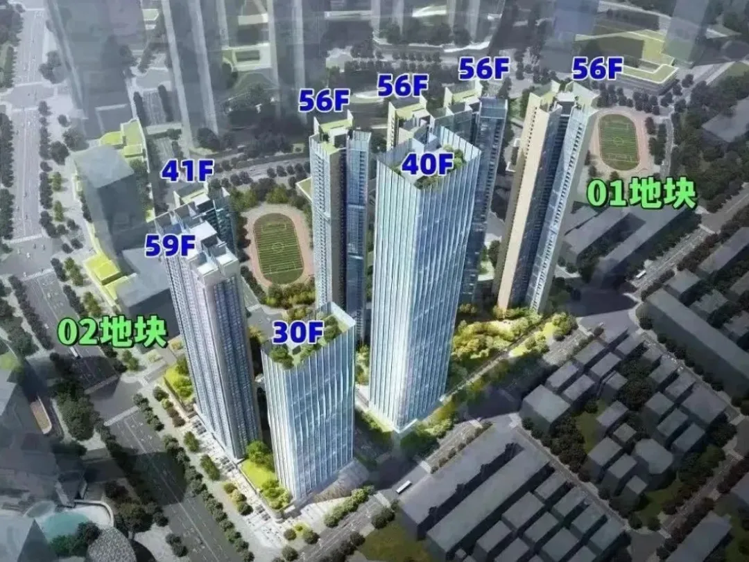 01-01地块占地约1.93万平方米,总建筑面积约23.8万平方米,容积率为8.81,绿化率为40.01%。该地块由1栋40层的办公单元和4栋56层的住宅单元,还规划有公交首末站。地块总规划980户,住宅单元设计为3梯4户、3梯5户和3梯6户,规划停车位1533个。