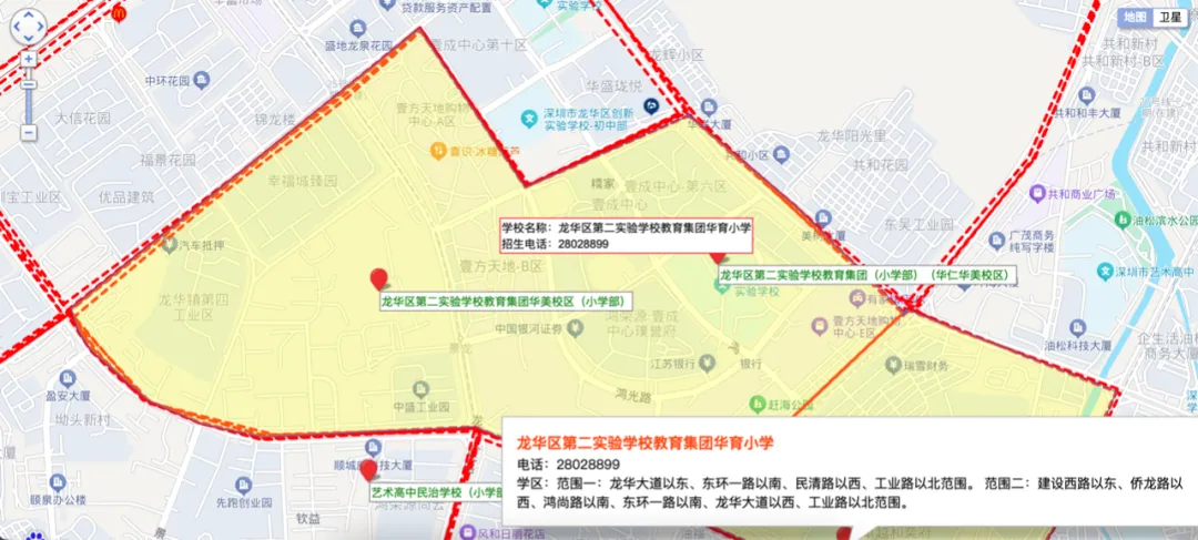 依据2025年龙华区教育局的学区划分方案,小学学区涵盖龙华第二实验学校华美校区及华仁华美校和华育校区;初中学区为龙华区清泉外国语学校初中部、龙华区新华中学教育集团初中二部、龙华区新华中学教育集团松和学校初中部、龙华区教育科学研究院附属外国语学校初中部。