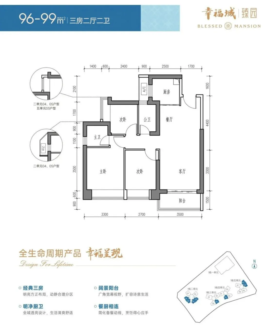 面积:96-99㎡三房两厅一卫