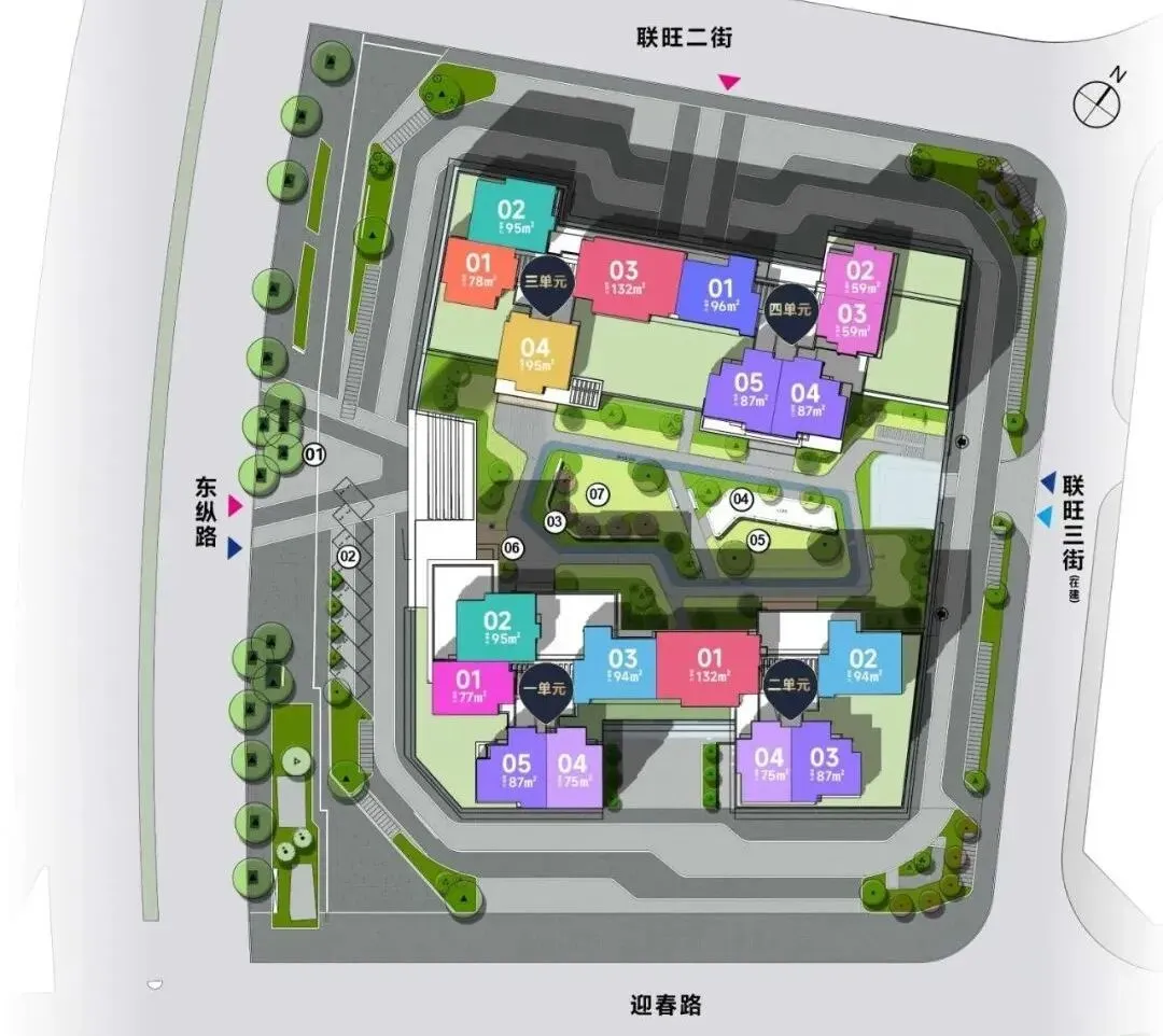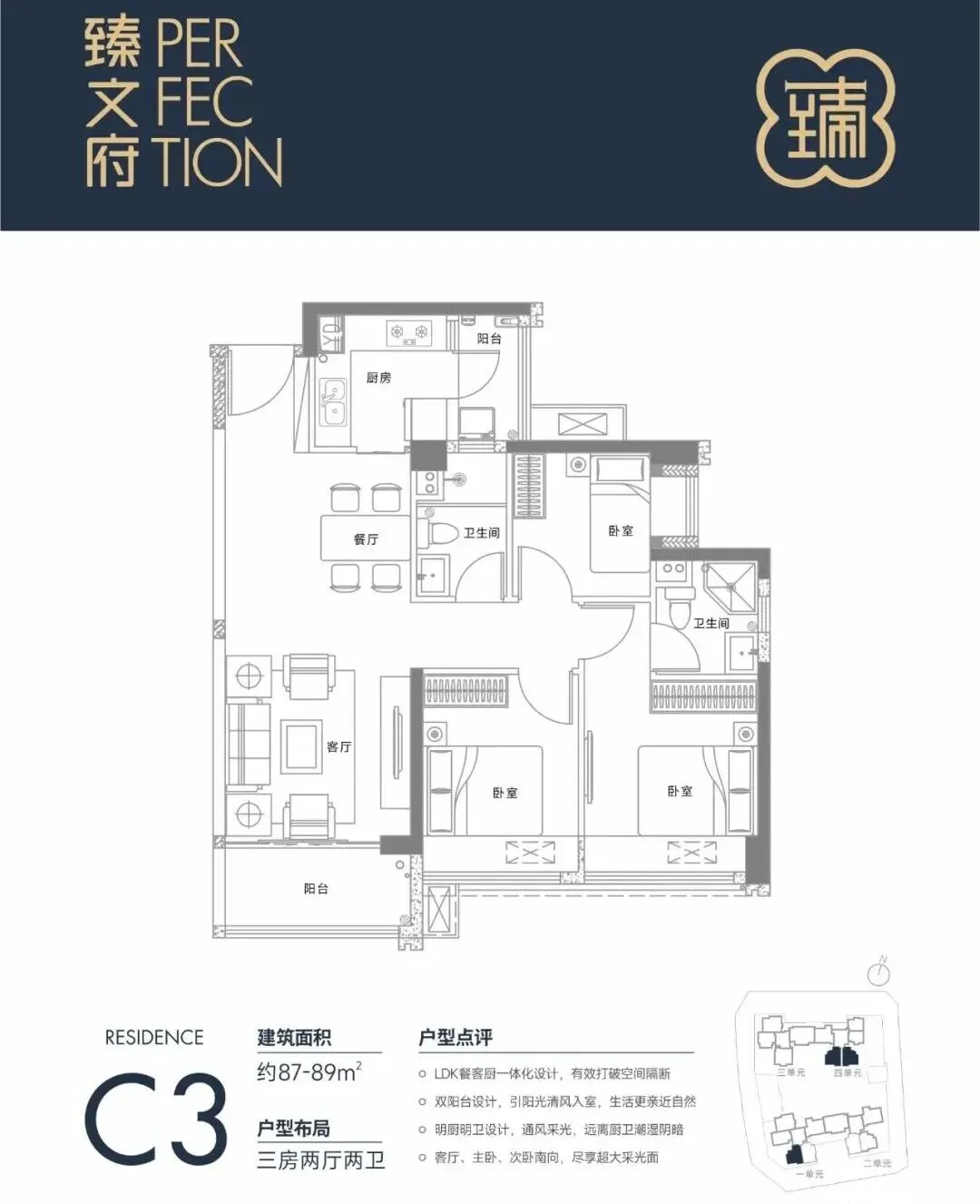 78㎡的2房2厅1卫,设计的是竖厅格局,进门入户玄关,客厅3.4米开间,三开间朝南,L型厨房还带1个小生活阳台,卫生间干湿分离,得房率约85%(包含赠送),阳台朝东南向。87㎡的3房2厅2卫,设计的是经典竖厅格局,进门入户玄关,LDKB一体化设计,三开间朝南,L型厨房还带1个小生活阳台,卫生间干湿分离,得房率约85%(包含赠送),阳台朝东南向。