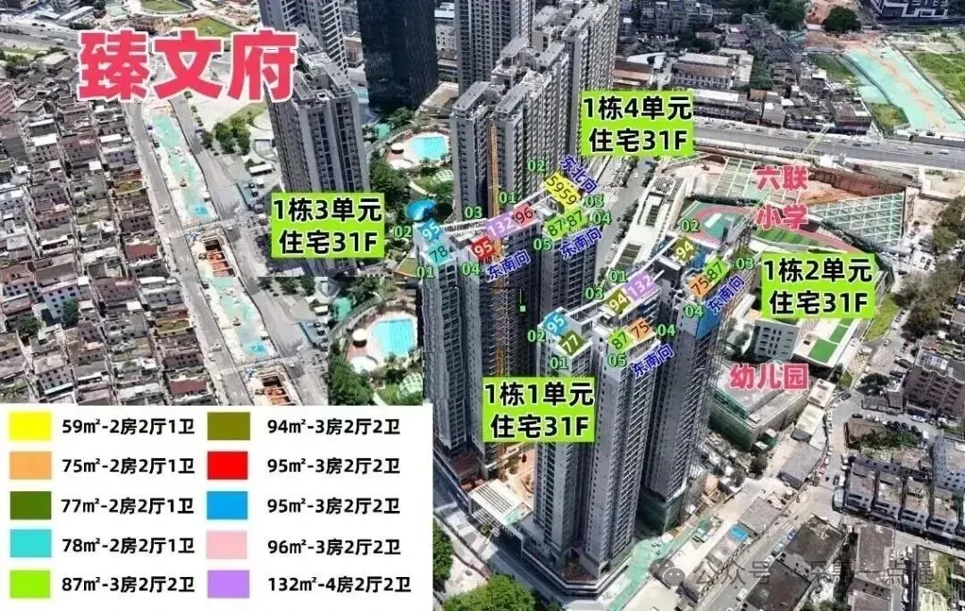 臻文府,由坪山本地房企六和集团打造,也是六和城二期,总占地面积约0.92万㎡,总建筑面积约6.85万㎡,计容建筑面积约5.32万㎡,容积率5.76,绿化率25%,共由4栋总高31层住宅组成,分别是1栋/1/2/3/4单元,另外配建1所9班制幼儿园。总规划520户,1栋1/4单元是2梯5户,1栋2/3单元是2梯4户,地下2层,停车位358个,停车位占比约1:0.69。