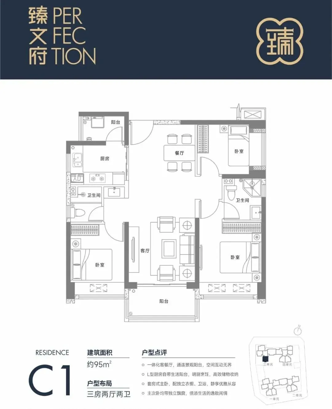 95㎡的3房2厅2卫,设计的是双龙抱珠格局,客厅3.4米开间,一体化客餐厅,三开间朝南,L型厨房还带1个小生活阳台,公卫三段式分离设计,得房率约85%(包含赠送),阳台朝东南或西北向。