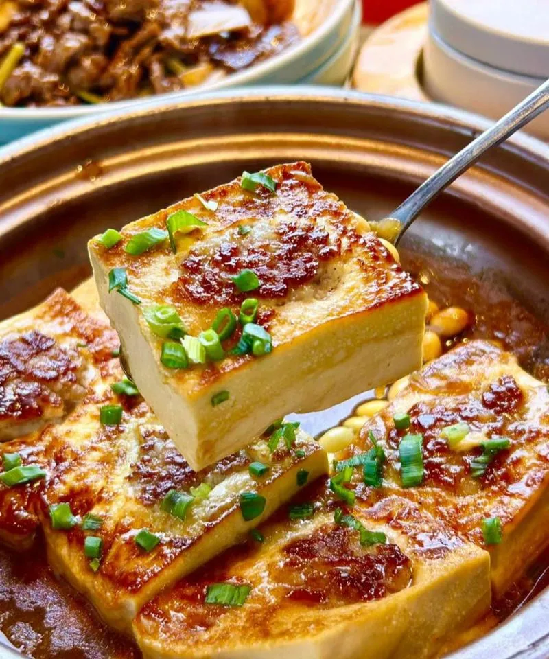做法极讲究:豆腐要用本地黄豆磨的,把肉馅塞进去,下锅煎到两面金黄,再用砂锅慢炖。吃的时候,夹起一块,豆腐皮脆肉嫩,里面的馅汁水四溢,那一刻你会觉得,给个CBD写字楼的工位都不换