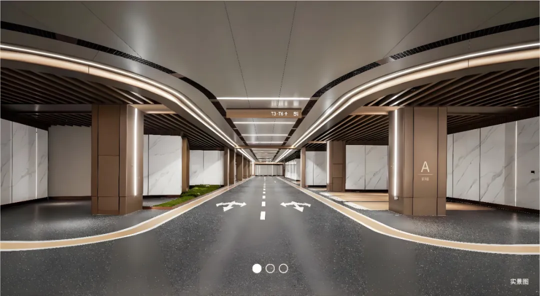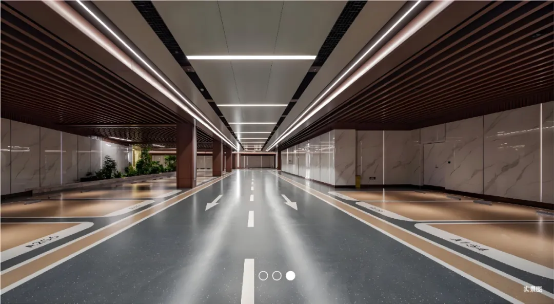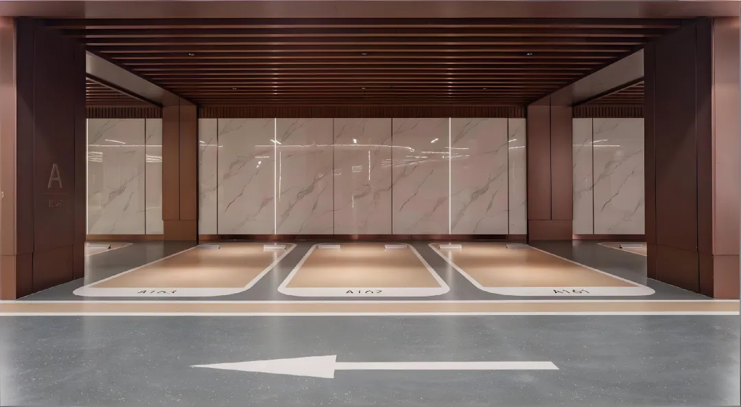 地下车行入口采用5-15°的缓坡设计,引导车辆从容驶入,于静谧过渡中告别城市喧嚣。负一层车库拥有7米宽的阔绰车道与3.9米的高挑净空,轻松容纳GMC、奔驰斯宾特等商务巨轮,每一次归家都尽显从容尊崇。从入口的从容基调出发,一套完整的空间秩序由此展开。 车库以酒店级精装标准打造,空间通透延伸,全铝板包覆的柱体与墙面、顶部的线性光带及序列铝板格栅和谐呼应,地面采用全环氧磨石一体成型,精密拼花工艺呈现镜面质感。7米双向车道与6米单向车道,搭配分区清晰的泊位,构建高效行停秩序。7×3.5米、6×2.5米、5.5×2.5米等多元车位尺度,从容适配SUV、超跑等各型座驾,功能与高阶生活方式在此完美融合。