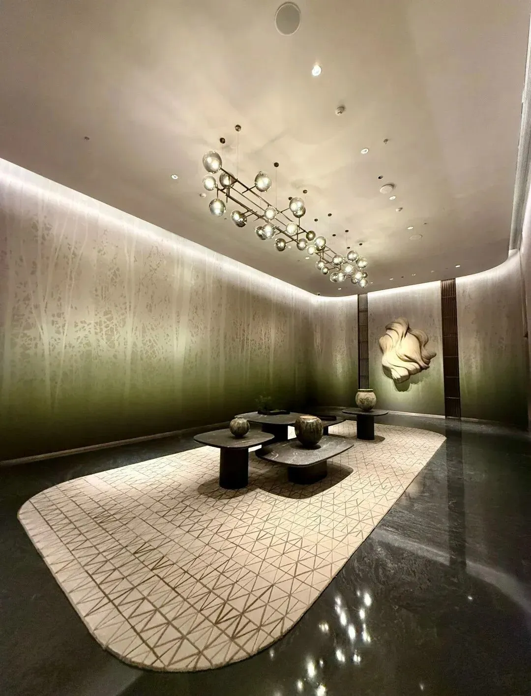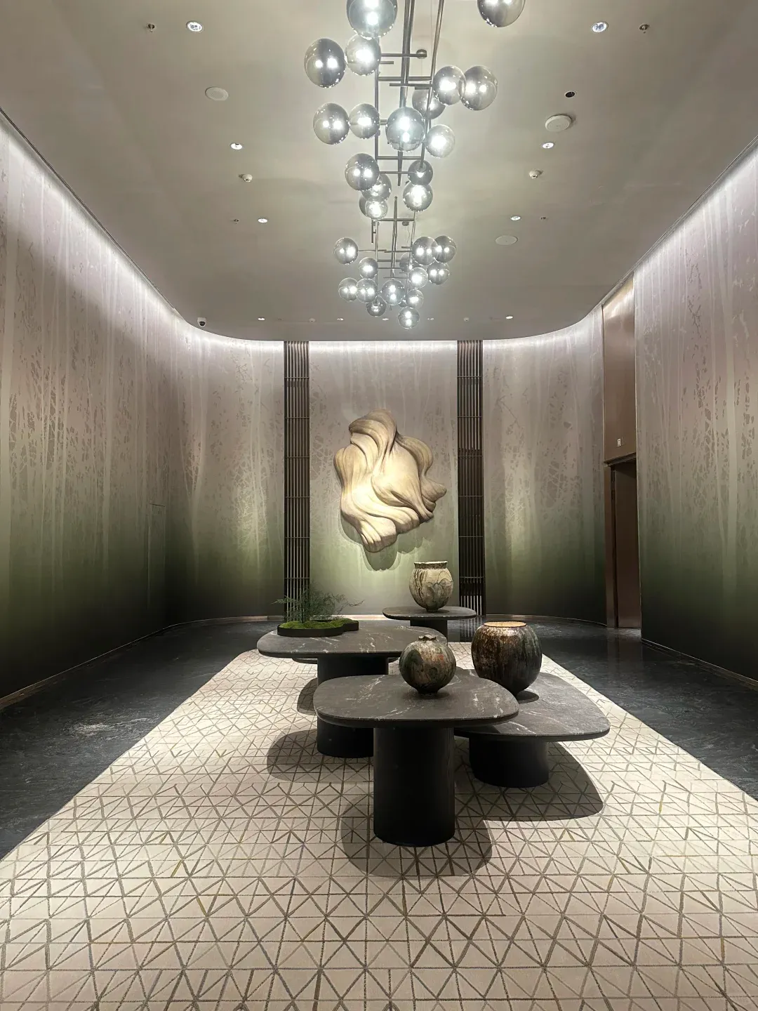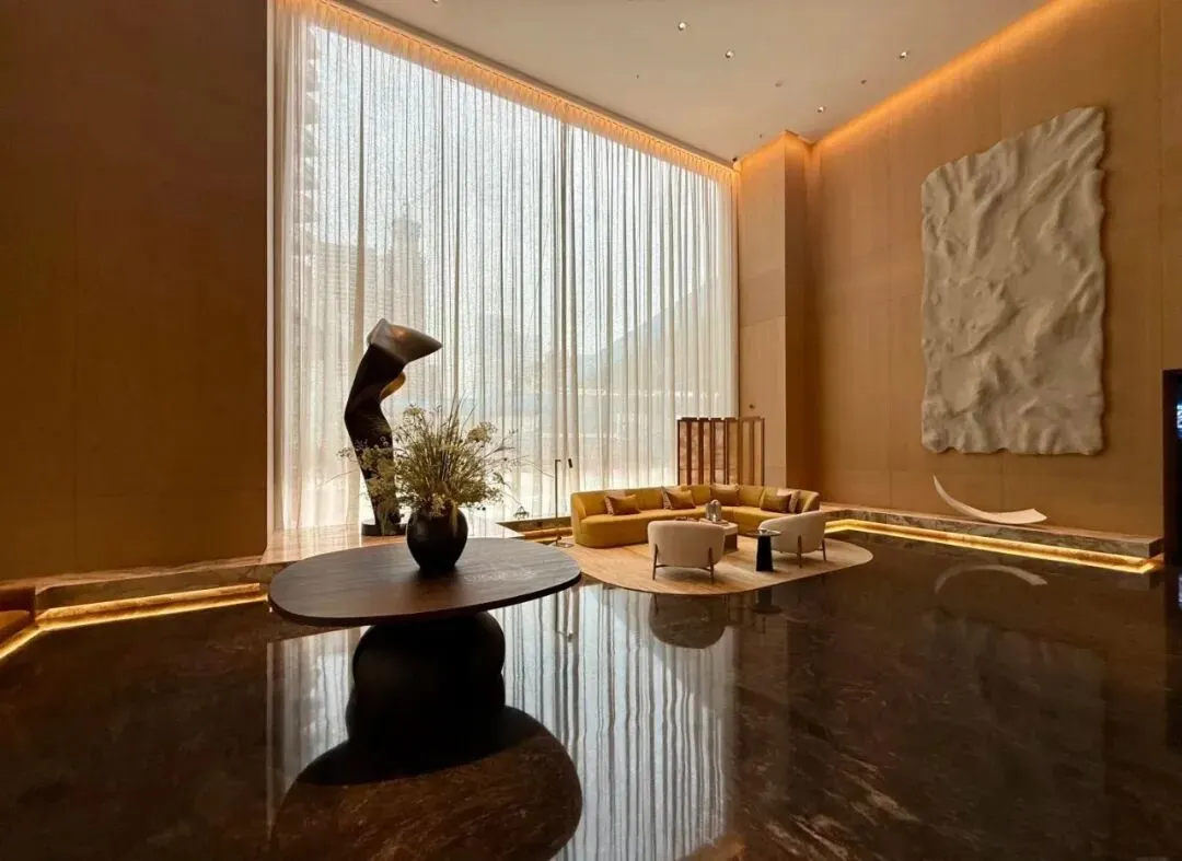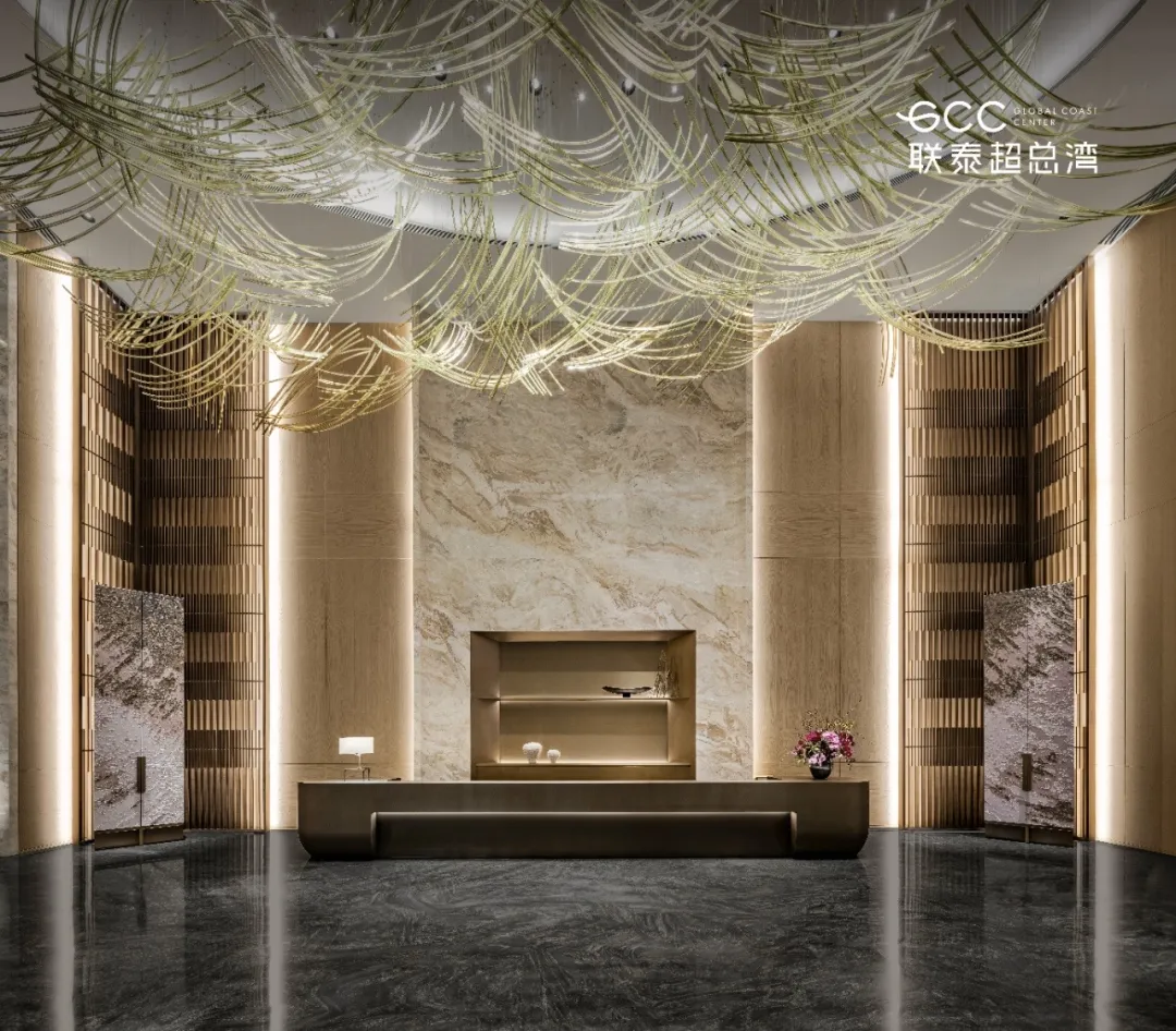 约 11 米层高、450㎡的主入户大堂,是归家的第一重仪式感。天然石材的温润纹理、实木饰面的细腻质感与金属线条的简约利落交织相融,搭配定制艺术吊灯—— 其设计灵感源自华侨城湿地的水草形态,以向上的艺术形态,将自然生机融入空间。
