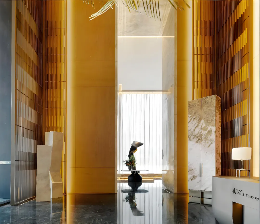 双大堂设计实现主仆分流,电梯厅采用高定石材与金属格栅打造界面,每一处材质的选择、每一盏灯光的排布,都遵循雅布标志性的 “极简奢华” 美学,让塔尖人群在踏入家门的瞬间,便能卸下疲惫,沉浸于沉静奢雅的氛围。