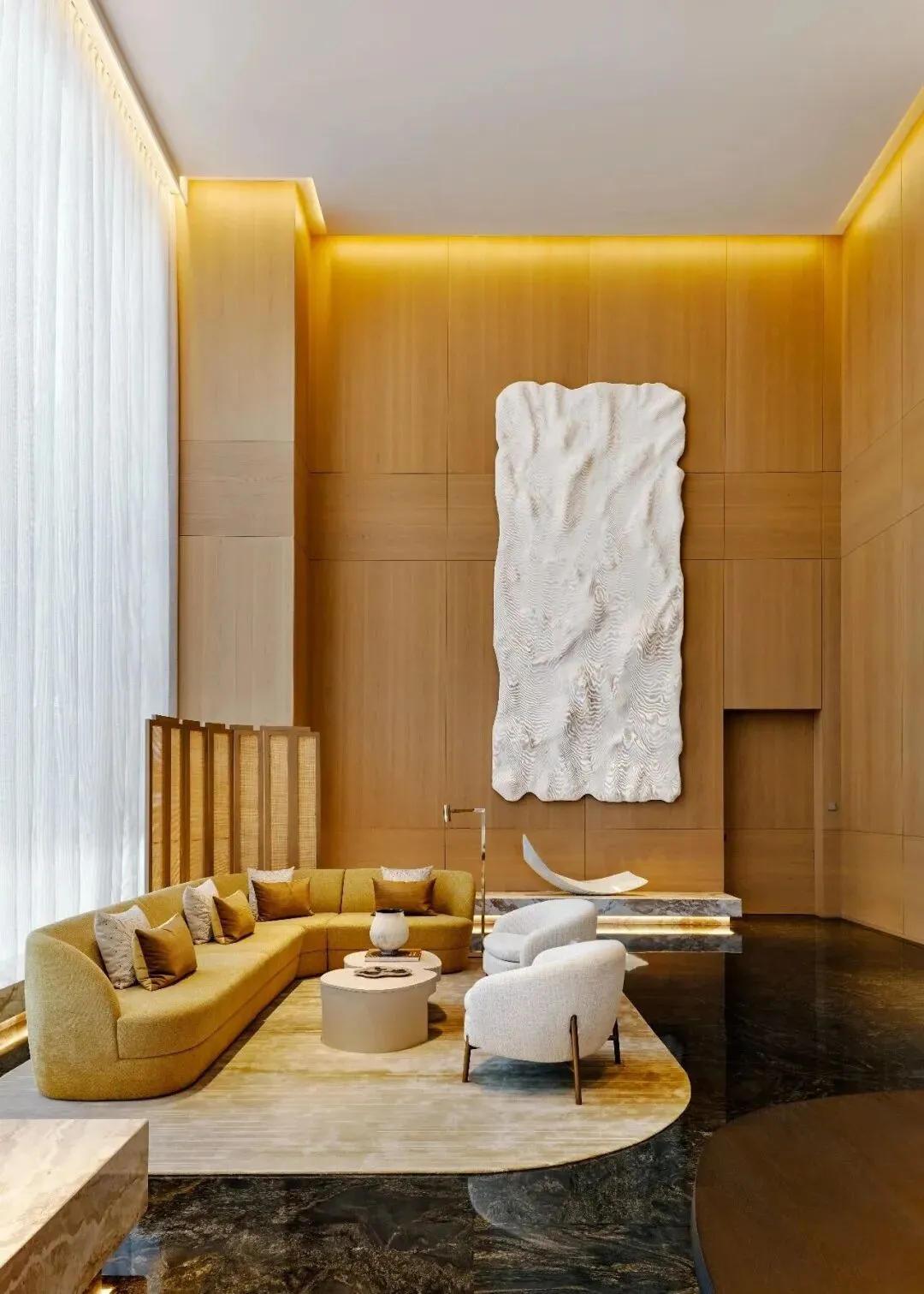 联泰超总湾的公区设计,由全球顶尖设计团队 Yabu Pushelberg(雅布) 领衔,以 “与海共生” 为核心理念,将湿地生态与滨海美学融入空间肌理,构建沉浸式的归家礼序。