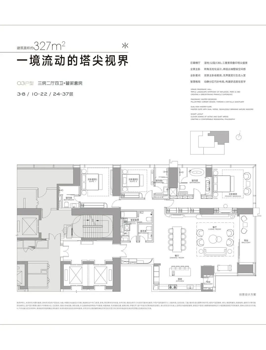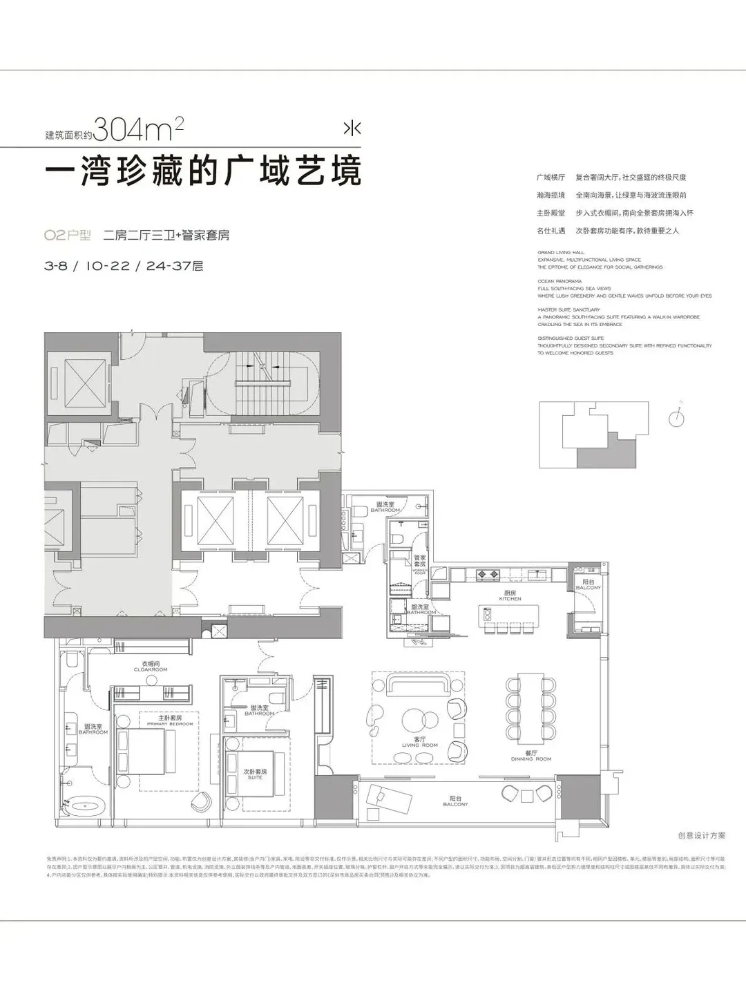 联泰超总湾以纯大户规划为核心,摒弃小户型杂糅,首发 T3 栋推出 304㎡、327㎡、402㎡三大主力户型,更规划 568-1032㎡定制大平层 / 复式与 35 栋商墅,适配家族居住、企业总部接待等多元需求。所有户型均遵循 “尺度至上” 的设计逻辑,以多套间、家政套间、高得房率的特质,重新诠释顶豪的居住本质。