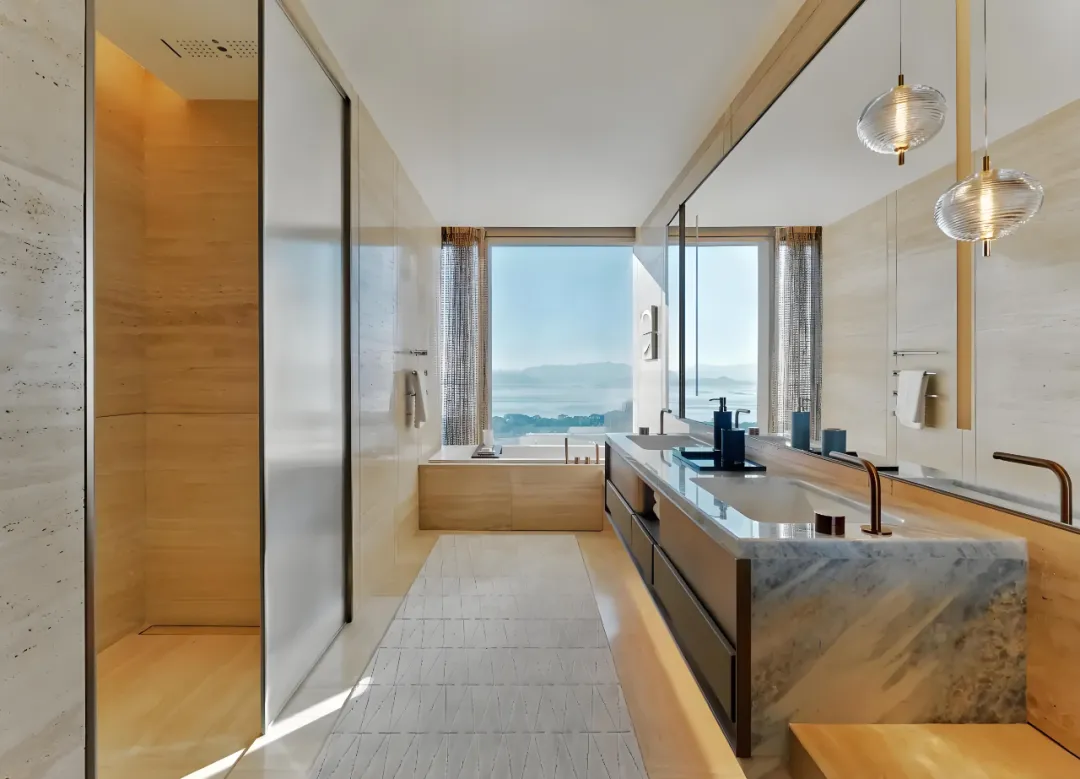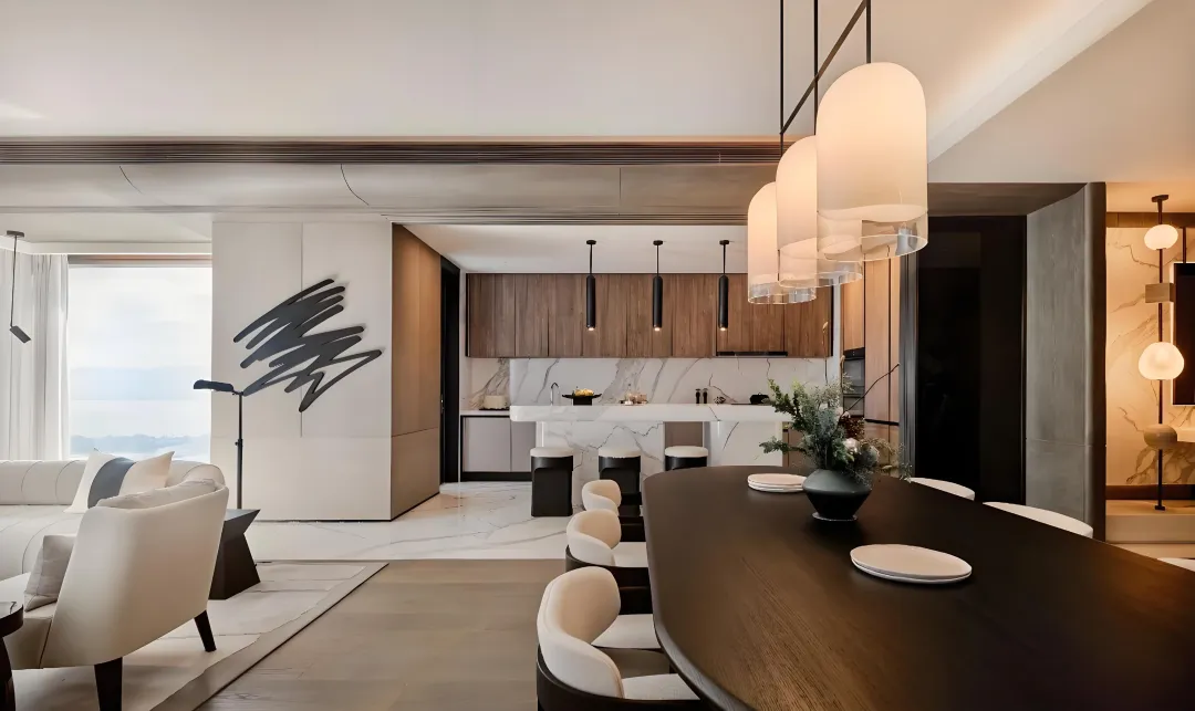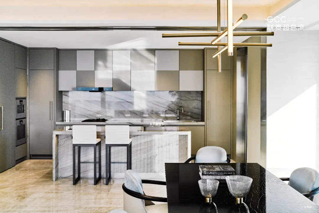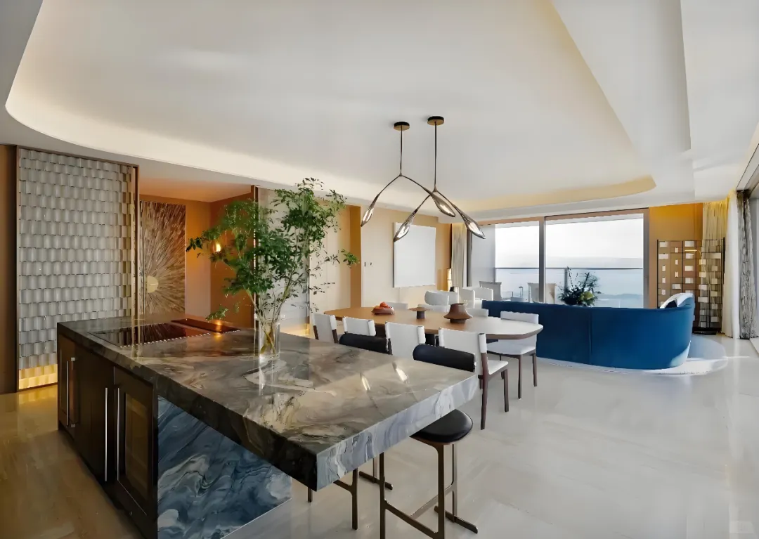 以 “空间讲述故事” 为核心,将天光海韵凝练为日常空间。客餐厅采用玻璃幕墙设计,270° 海景视野无遮挡,天然石材地面与木饰面墙面相融,定制艺术吊灯打造层次丰富的光影氛围;主卧双开门礼序入户,Rimadesio 玻璃隔断搭配金属格栅背景,以极简设计凸显奢华本质;全房智能系统与进口洁具橱柜,让科技与质感融入生活点滴。