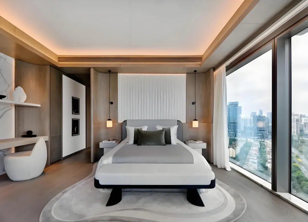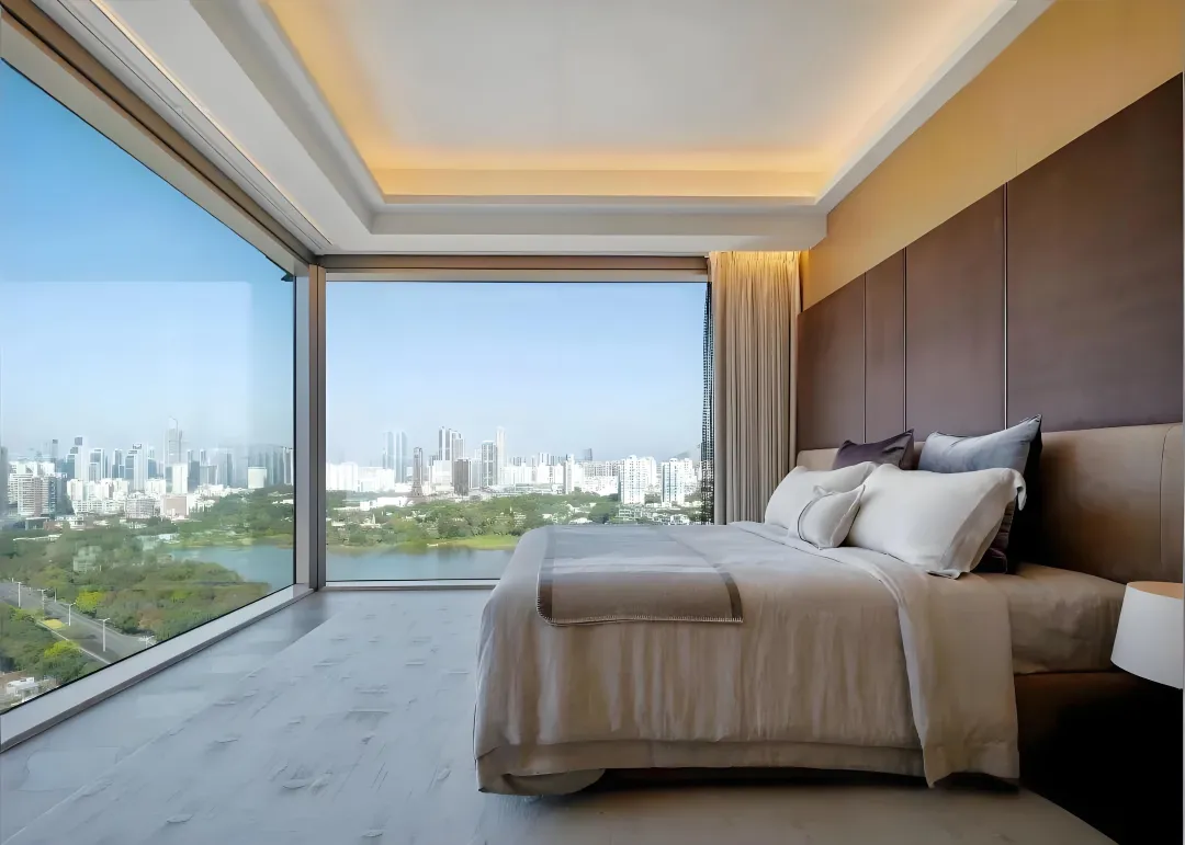 雅布亲创的 402㎡户型,以单端头三面采光设计,实现南向看深圳湾、北向望湿地的双景资源,270° 无遮挡视野将山海生态尽收眼底。四套间布局搭配主仆双动线,保障居住私密与生活便利,主卧双开门礼序入户,步入式衣帽间如 “蓝色珠宝匣”,Rimadesio 玻璃系统与光影共舞,尽显顶豪的奢华质感。