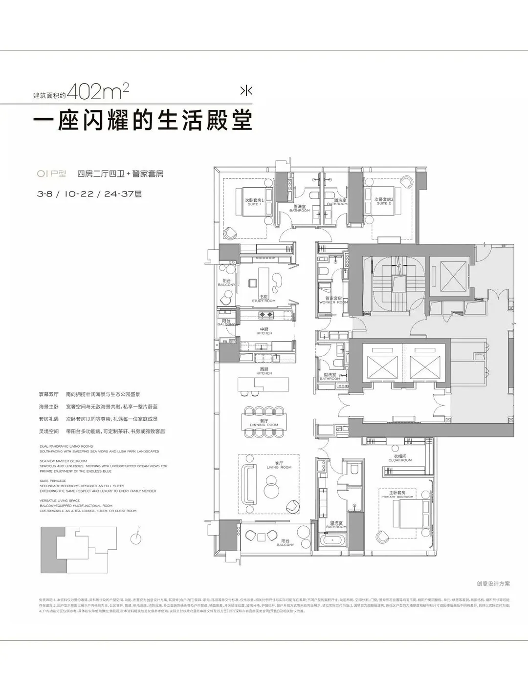 568-1032㎡定制大平层 / 复式,层高最高 3.9 米,私梯入户,5+1 房起的布局适配家族聚居需求,高区户型可享 270° 环幕海景,为塔尖家族打造传世级居住空间。