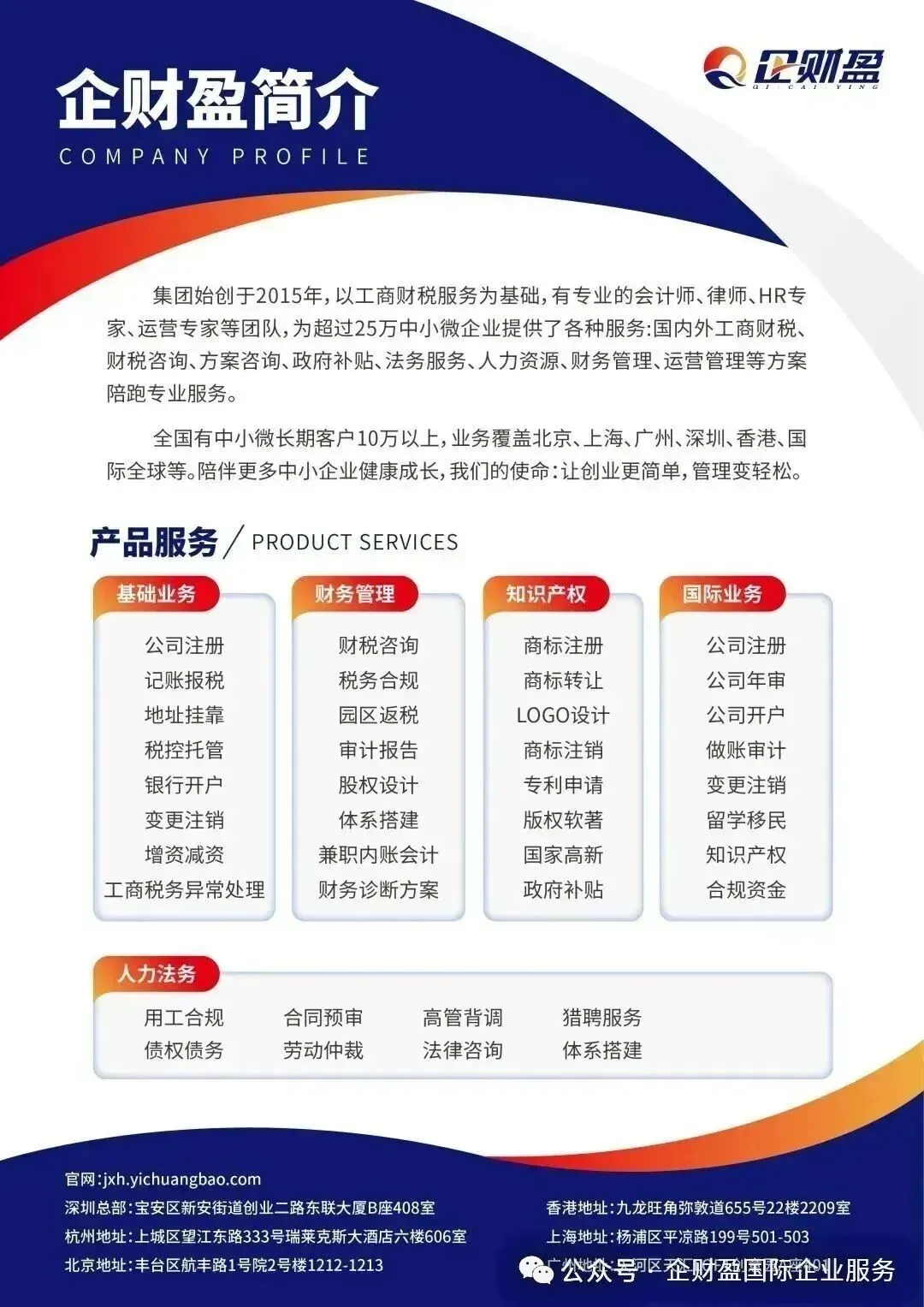 企财盈作为专业的一站式商务服务平台,致力于为广大客户提供内地公司注册、香港公司注册、离岸公司注册、记账报税、年审审计、对公开户、财税合规、股权架构、ODI备案、跨境电商服务、香港身份、移民留学等高质量服务,助力企业全球化发展。企业一站式服务,可以加我微信(电话同V:13312938845) 随时咨询↓↓↓