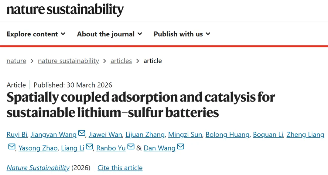 2026年03月30日,深圳大学王丹/于然波教授与合作者在Nature Sustainability期刊发表题为“Spatially coupled adsorption and catalysis for sustainable lithium-sulfur batteries”的研究论文。该工作构建了sp-N掺杂石墨炔中空多壳层结构(sp-N GDY HoMS),通过在同一载体中实现多硫化物吸附位点与催化位点的空间耦合,系统解决了锂硫电池中高比能与长寿命难以兼顾的关键问题。该体系实现了93.9%的超高硫负载、基于硫与HoMS总质量的1462 mAh g⁻¹近理论容量、10C条件下1384.5 Wh kg⁻¹的能量密度与600圈稳定循环,并在软包电池中实现约457 Wh kg⁻¹的器件级能量密度。