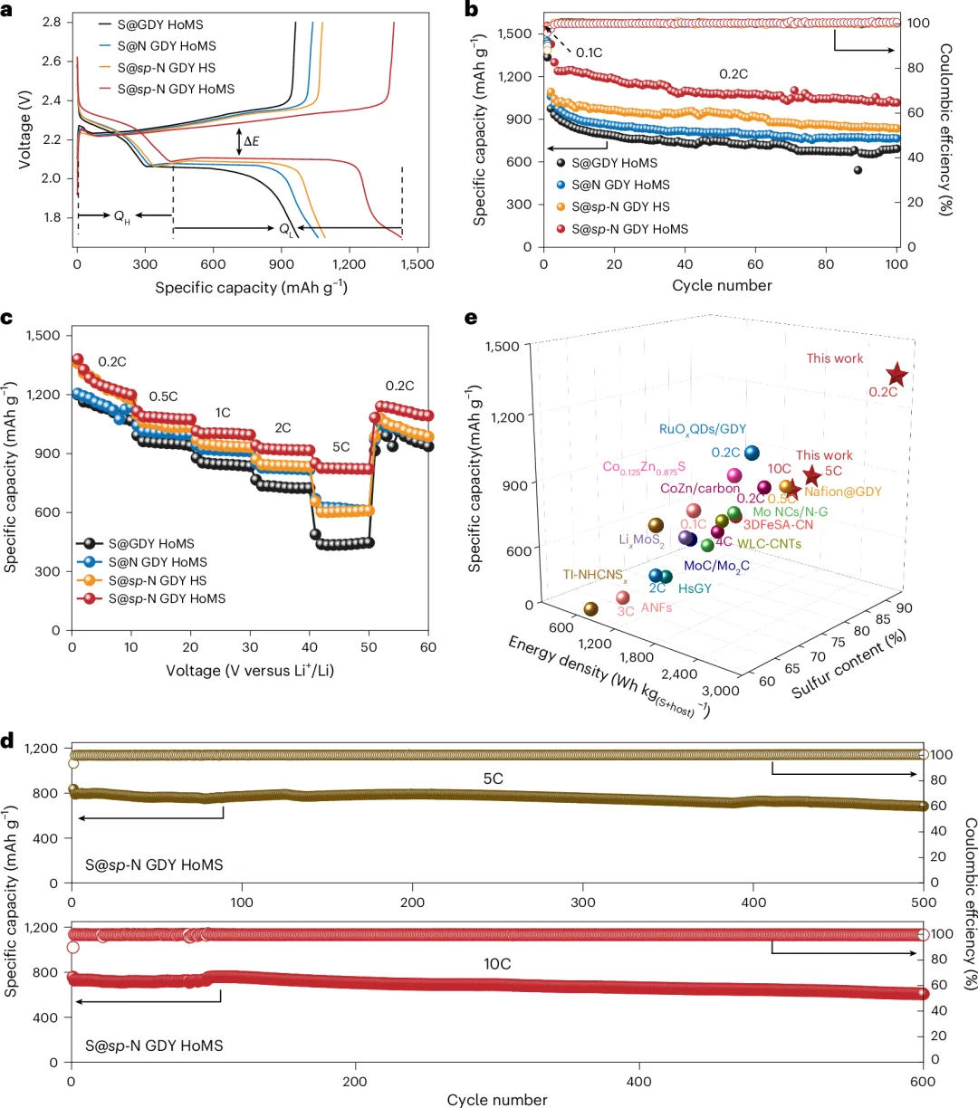这项工作所解决的核心问题是:稳定性提升不再以牺牲实际能量密度为代价。 在0.2C条件下,sp-N GDY HoMS电极表现出更低的极化和更高的放电平台,显示出更快的硫氧化还原动力学;在0.2C循环100圈后,容量仍保持1014.2 mAh g⁻¹。倍率测试中,该体系在0.2C、0.5C、1C、2C和 5C下分别实现1380.7、1115.0、1014.8、941.8和850.6 mAh g⁻¹,当倍率恢复至0.2C后,容量可回升至1140.0 mAh g⁻¹。更重要的是,在更严格的“硫+HoMS总质量”统计下,该体系仍实现1462 mAh g⁻¹的近理论容量,并在10C条件下维持1384.5 Wh kg⁻¹的能量密度和600 圈稳定循环。这表明本工作真正突破的是锂硫电池长期存在的结构性矛盾:在不显著增加非活性质量的前提下,同时实现高比能输出与长循环寿命。