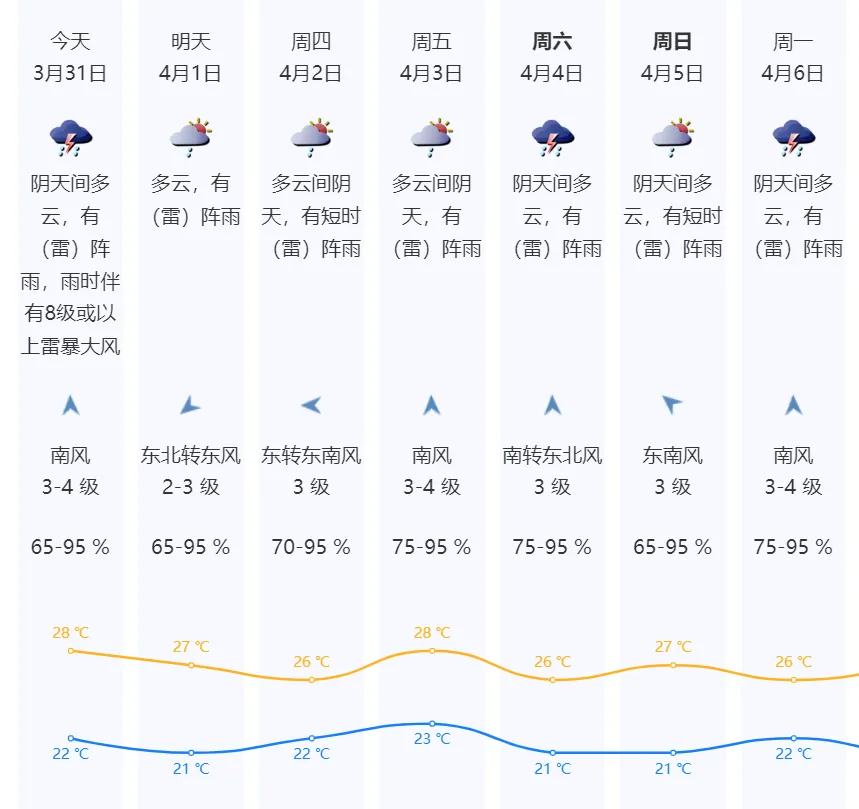 深圳今日阴天间多云,有(雷)阵雨,雨时伴有8级或以上雷暴大风;南风3-4级,相对湿度65-95%;气温22-28℃。