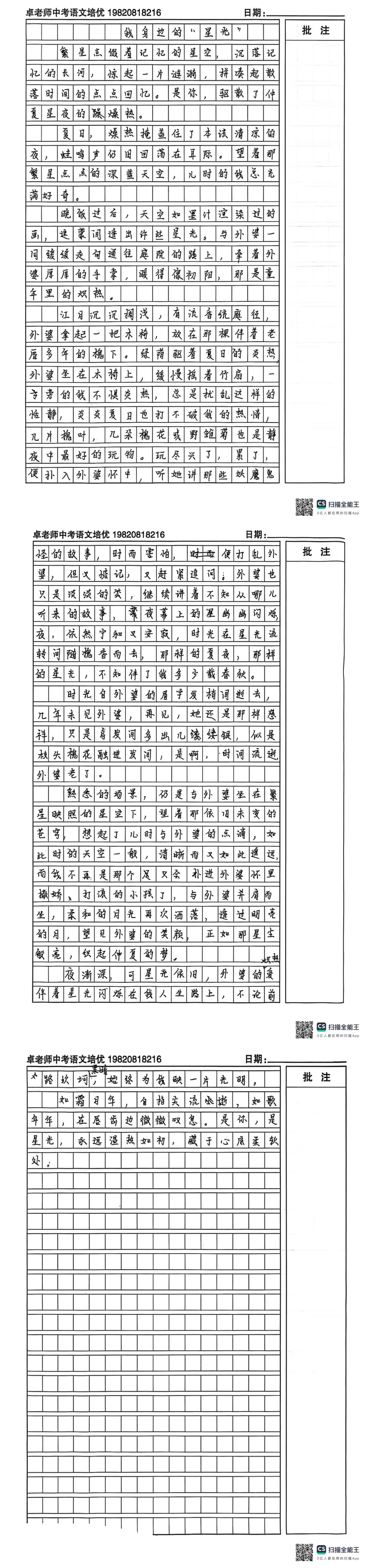 这篇《我身边的“星光”》情感真挚,以“外婆”为核心意象,将亲情比作夏夜星光,立意温暖且紧扣成长主题。作为中考培优作文,需在语言质感、逻辑层次、情感深度三个维度优化,使其更具考场高分潜质。