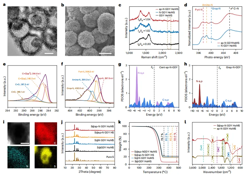 j、k S@GDY HoMS、S@N GDY HoMS、S@sp‑N GDY HS 与 S@sp‑N GDY HoMS 的 X 射线衍射图谱(j)与热重曲线(k)。