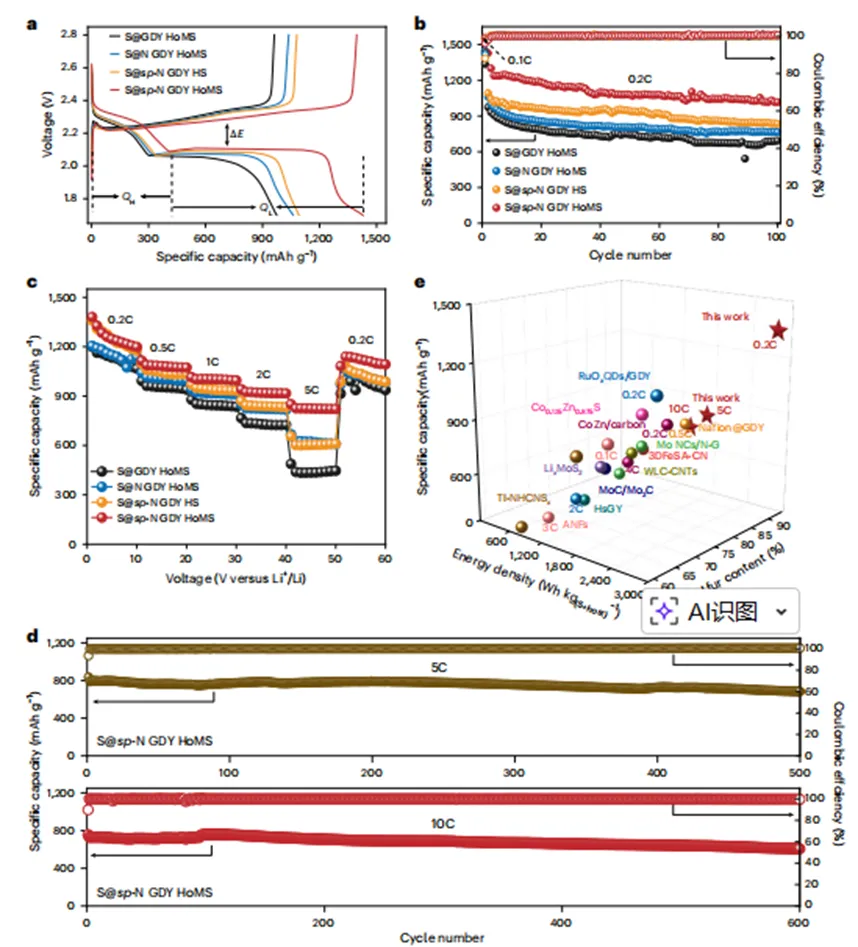 高硫负载与高容量:sp-N GDY HoMSs实现93.9%的超高硫负载率,0.1C下实现1462 mAh g_(S+host)⁻¹的近理论比容量,基于硫质量的初始放电比容量达1557 mAh g⁻¹,远超传统氮掺杂碳基主体体系。