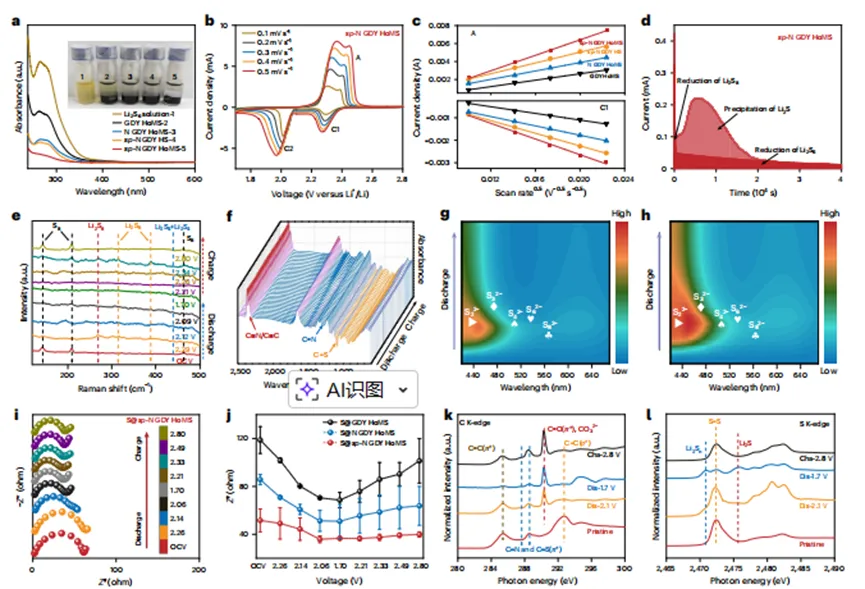 性能测试:组装扣式电池与软包电池,通过循环伏安法(CV)、恒电流充放电测试考核循环性能、倍率性能;利用电化学阻抗谱(EIS)分析电荷转移特性;通过多硫化锂吸附实验、Li₂S成核实验评估锚定与催化能力;结合原位拉曼、原位红外、原位紫外-可见光谱追踪电化学反应过程。