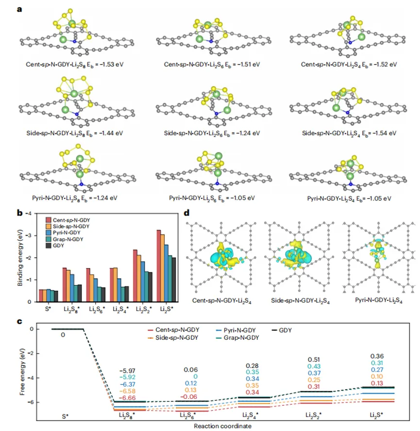 a、中心型 sp 杂化氮(Cent‑sp‑N)、边缘型 sp 杂化氮(Side‑sp‑N)及吡啶氮(Pyri‑N)掺杂石墨炔(GDY)上多硫化锂(LiPSs)的优化吸附构型。