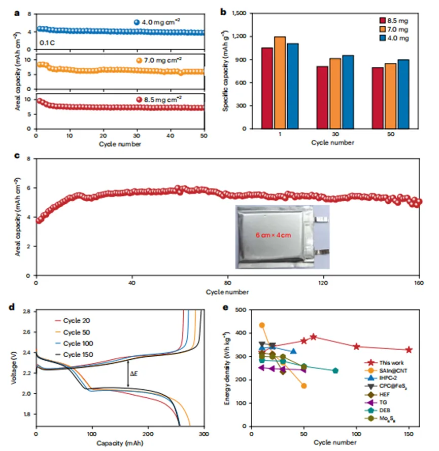高面负载与实用化性能:硫面负载提升至8.5 mg cm⁻²时,50圈后可逆面容量仍达7.2 mAh cm⁻²;组装的软包电池实现457 Wh kg⁻¹的高能量密度,且具备良好的柔性,折叠后仍可稳定供电。