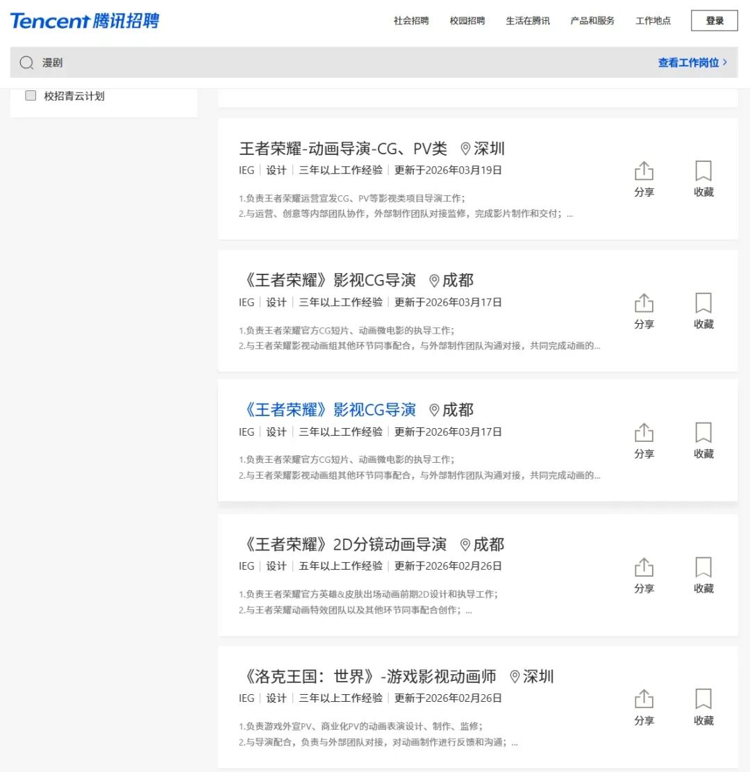 深圳作为互联网与科技企业聚集地,头部企业的布局直接带动了区域中小企业的岗位需求爆发,为填补人才缺口提供了核心支撑。其中,腾讯的布局尤为瞩目——其目前正在招聘的15个漫剧相关岗位中,有5个为设计类岗位,且均与自身游戏领域深度绑定,借助游戏IP与美术资源优势,探索AI漫剧的差异化发展路径。