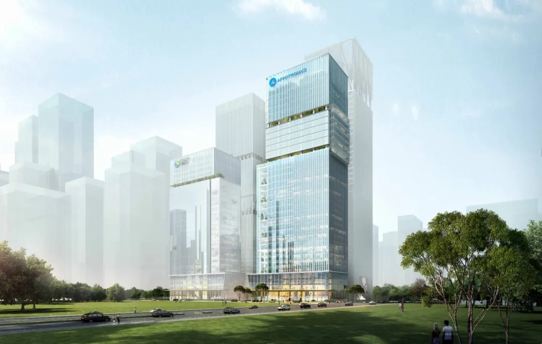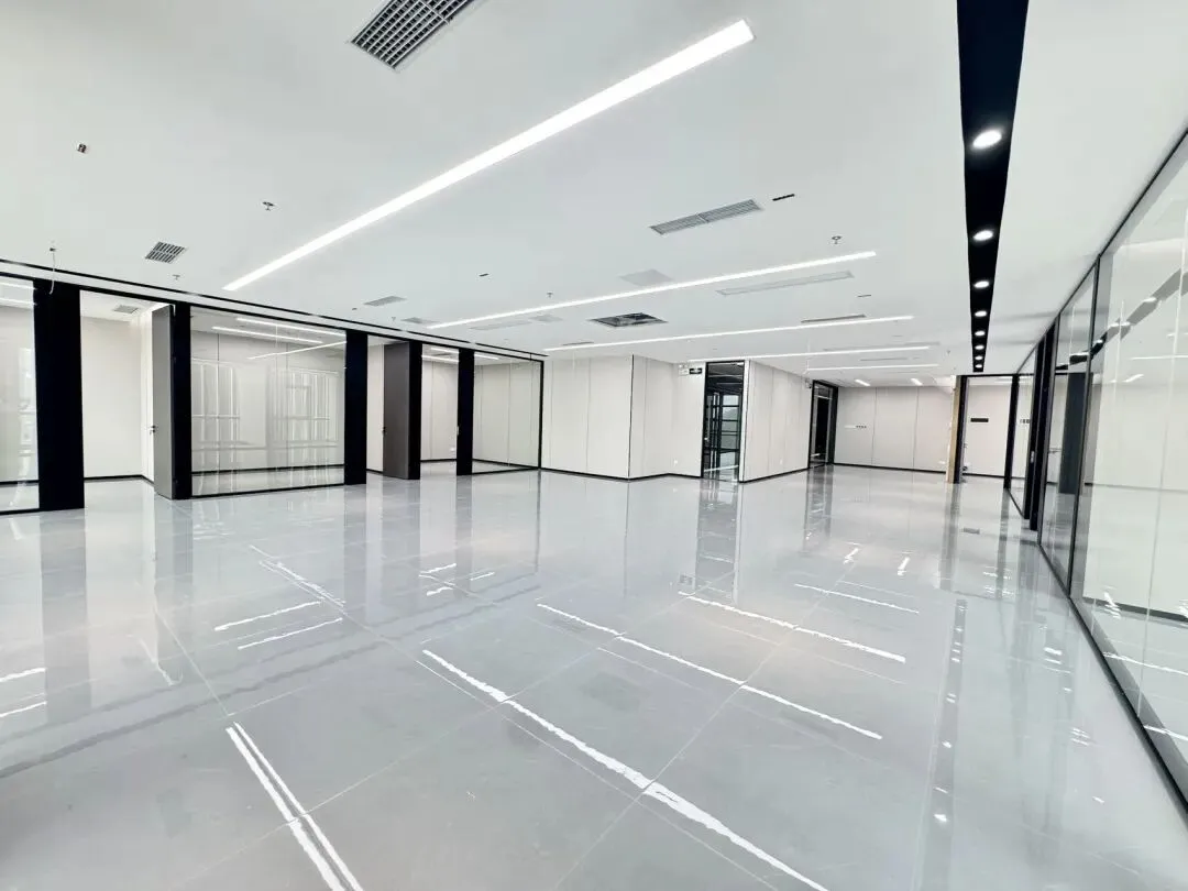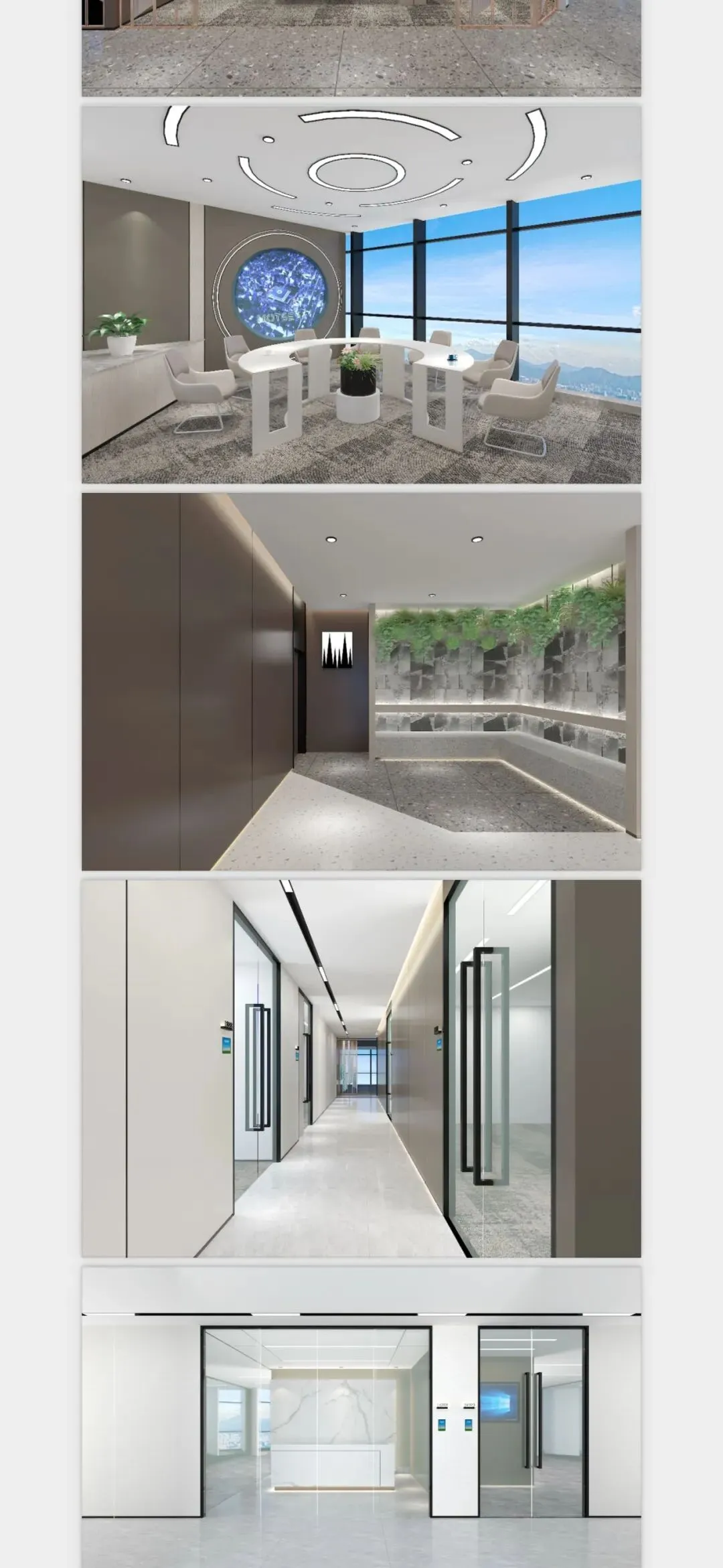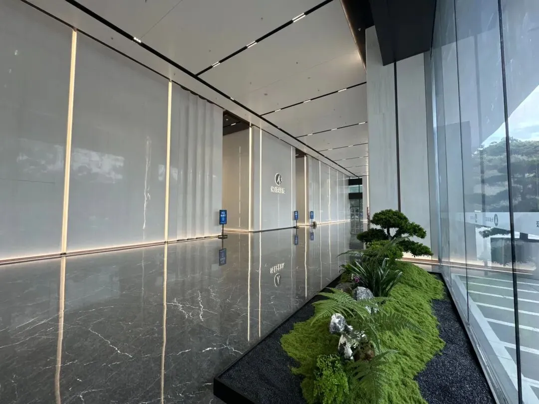 :航空级钛锌复合板 + 全幅智能调光幕墙,流线型造型;内部开放式办公布局,自然采光充足