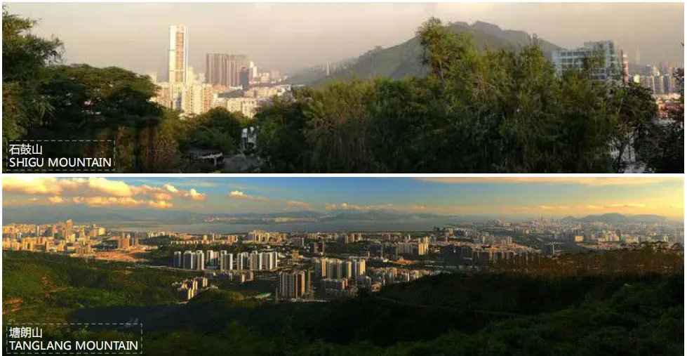 其中,洞尾山与石鼓山公园为直接视野可见景观,塘朗山公园、社区公园、西丽水库、城市绿轴由于外部或内部楼体遮挡,为局部高层可见景观。
