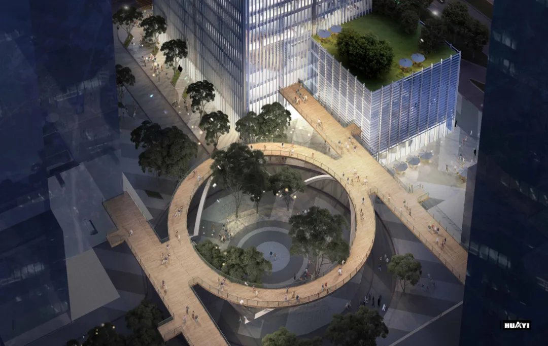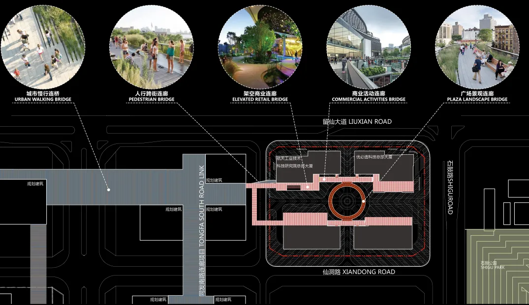 空中连廊分为:城市慢走连桥,人性夸街连廊,架空商业连廊,商业活动连廊,广场景观连廊