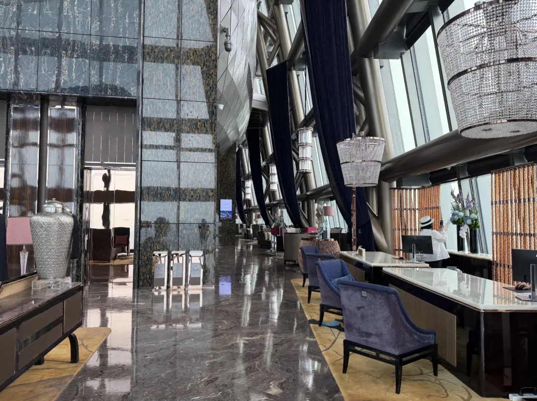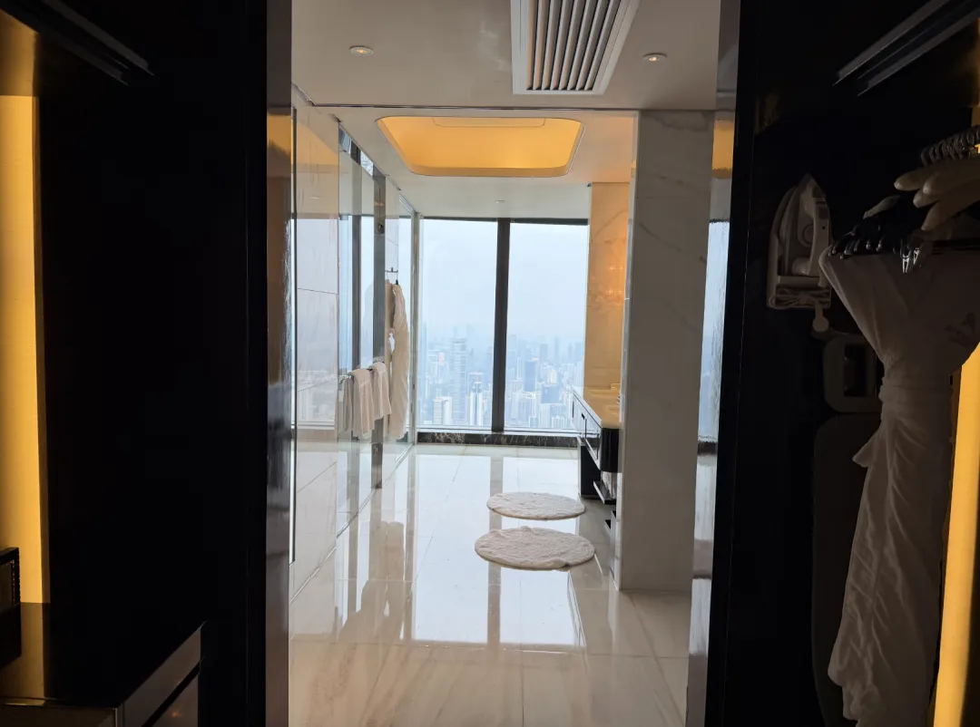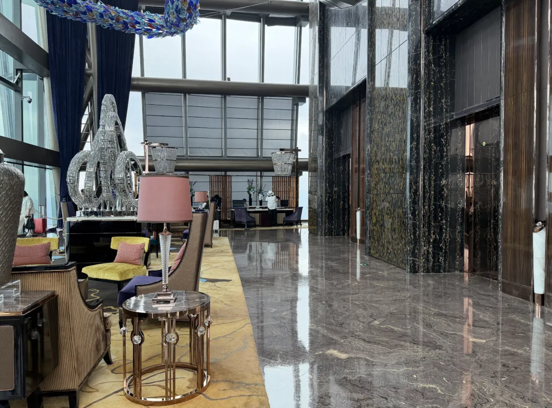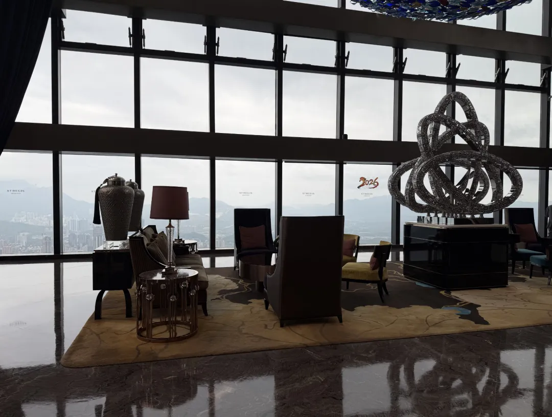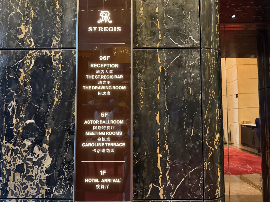 建筑由英国泰瑞·法瑞事务所操刀,室内设计是CCD。一楼落客区,巨大的门框中间挂着ST REGIS标志,第一眼就挺有气势。礼宾主动过来接行李,一路送到房间。大堂的吊灯也够华丽,但真正让我觉得「上来值了」的,是电梯——一分多钟,直达96层。