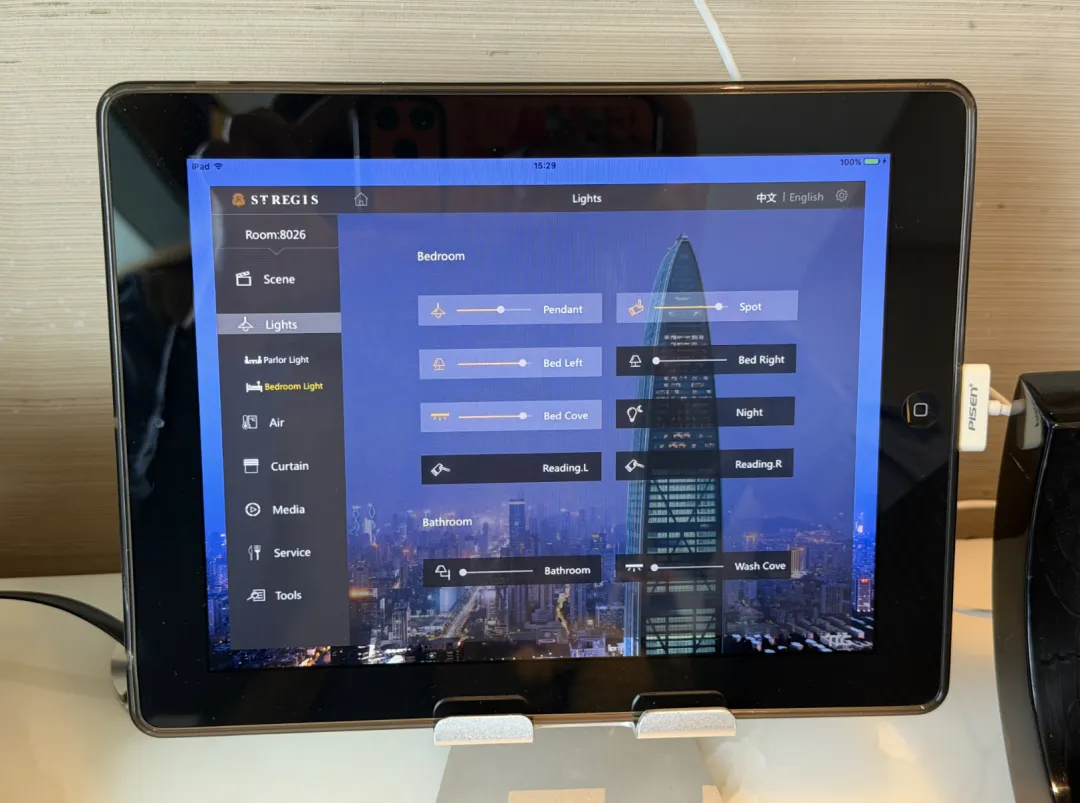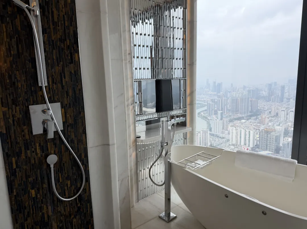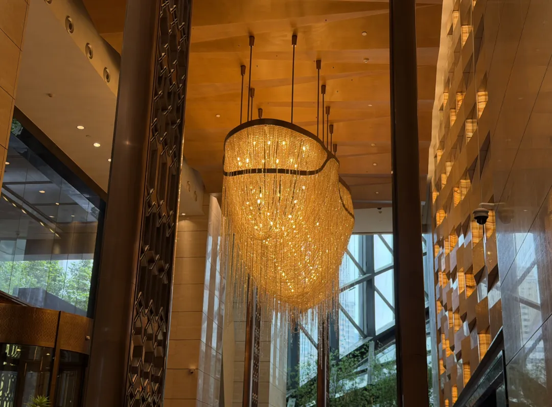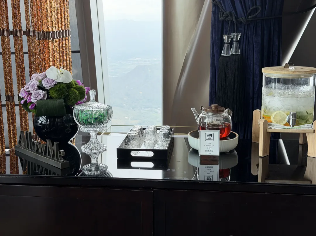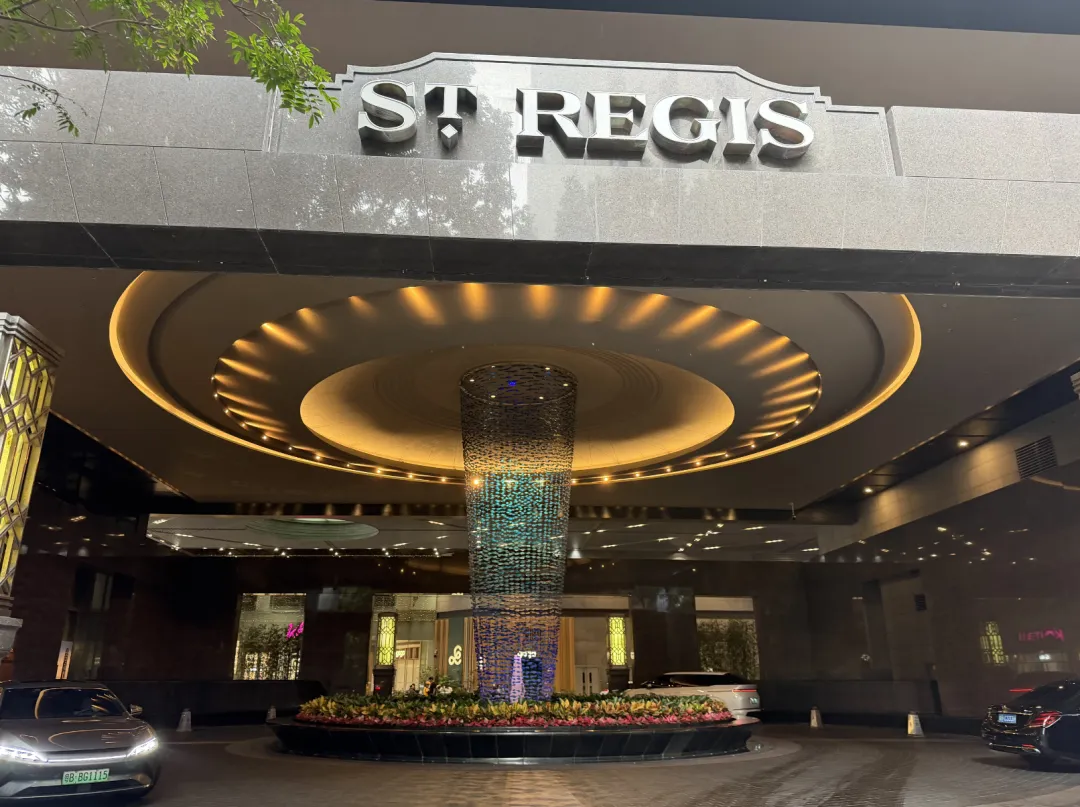 建筑由英国泰瑞·法瑞事务所操刀,室内设计是CCD。一楼落客区,巨大的门框中间挂着ST REGIS标志,第一眼就挺有气势。礼宾主动过来接行李,一路送到房间。大堂的吊灯也够华丽,但真正让我觉得「上来值了」的,是电梯——一分多钟,直达96层。