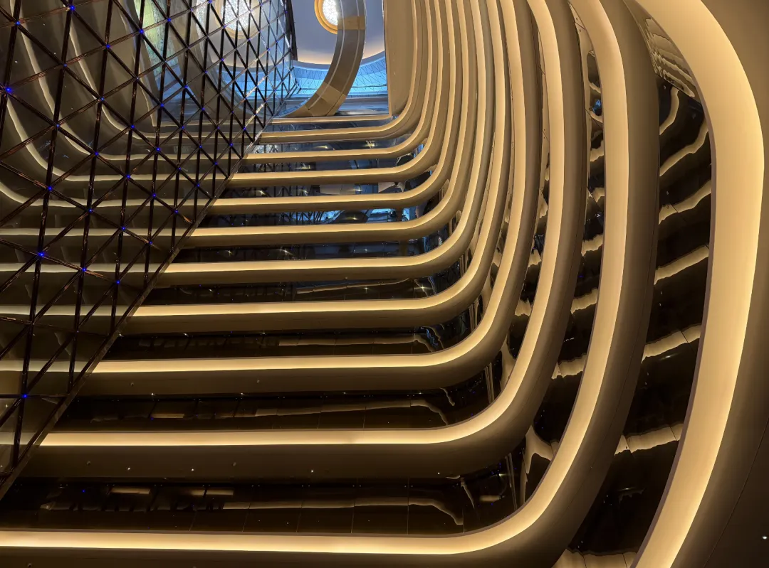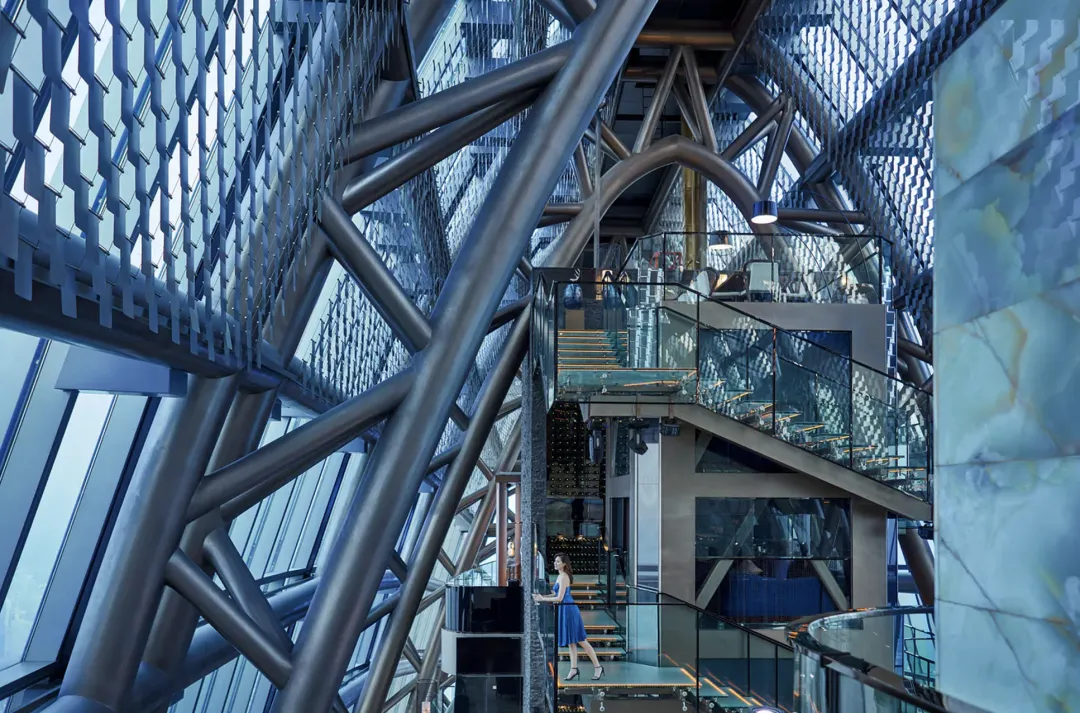 中庭那个吊灯加旋转楼梯,现在看依然有气势。楼梯连接96层大堂和95层餐厅,整个悬空,下面是20层落差的中庭。这个设计有点像上海金茂君悦,光线从底下绕上来,电梯在中间上上下下,视觉效果很好。