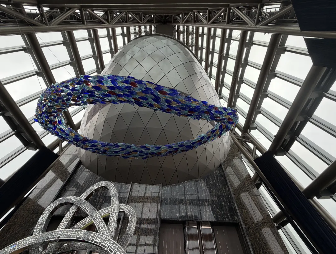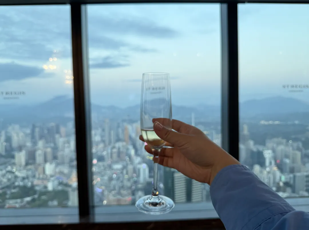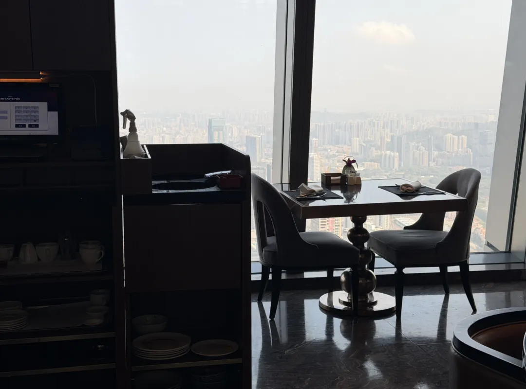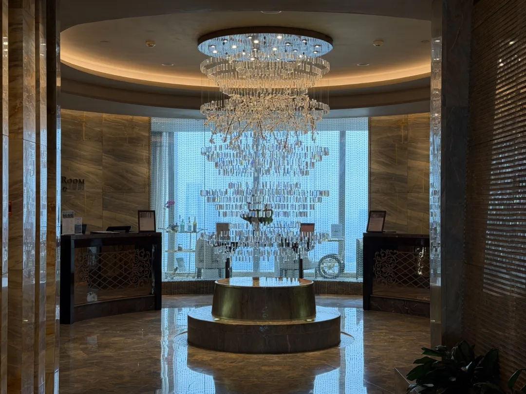 电梯门打开那一瞬间,视野一下就开了。中庭挑空差不多10层楼高,中间悬着一个橄榄球形状的飞艇功能区,搭配落地水晶灯、悬吊水晶灯、宝蓝色窗帘,看着确实像空中宫殿。大堂和大堂吧连在一起,环形结构,360度落地玻璃,深港全景就这么铺在眼前。玻璃擦得还算干净,视野通透。远处能看到平安金融中心,日落的时候可以拍一张夕阳、地标LOGO和天际线的合影。