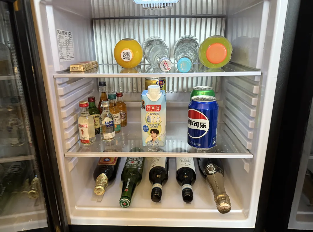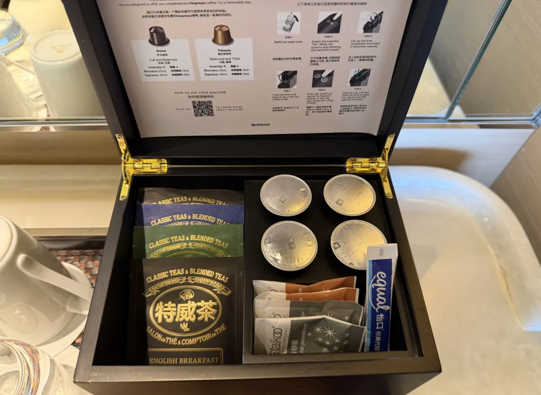 迷你吧免费水是巴玛铂泉,胶囊咖啡机配了4颗胶囊,TWG茶包4包,小冰箱收费。这个配置跟其他几家奢牌比,确实差点意思。
