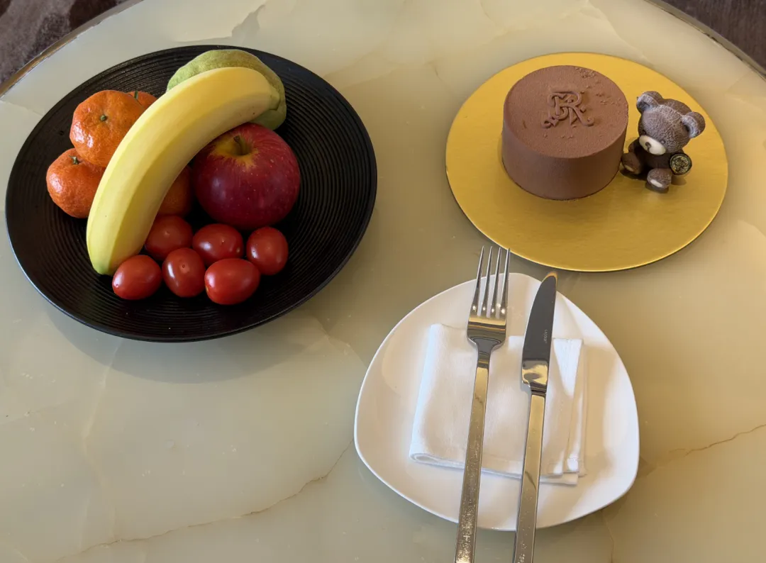欢迎礼是生日月入住送的,一小块蛋糕加一盘水果。