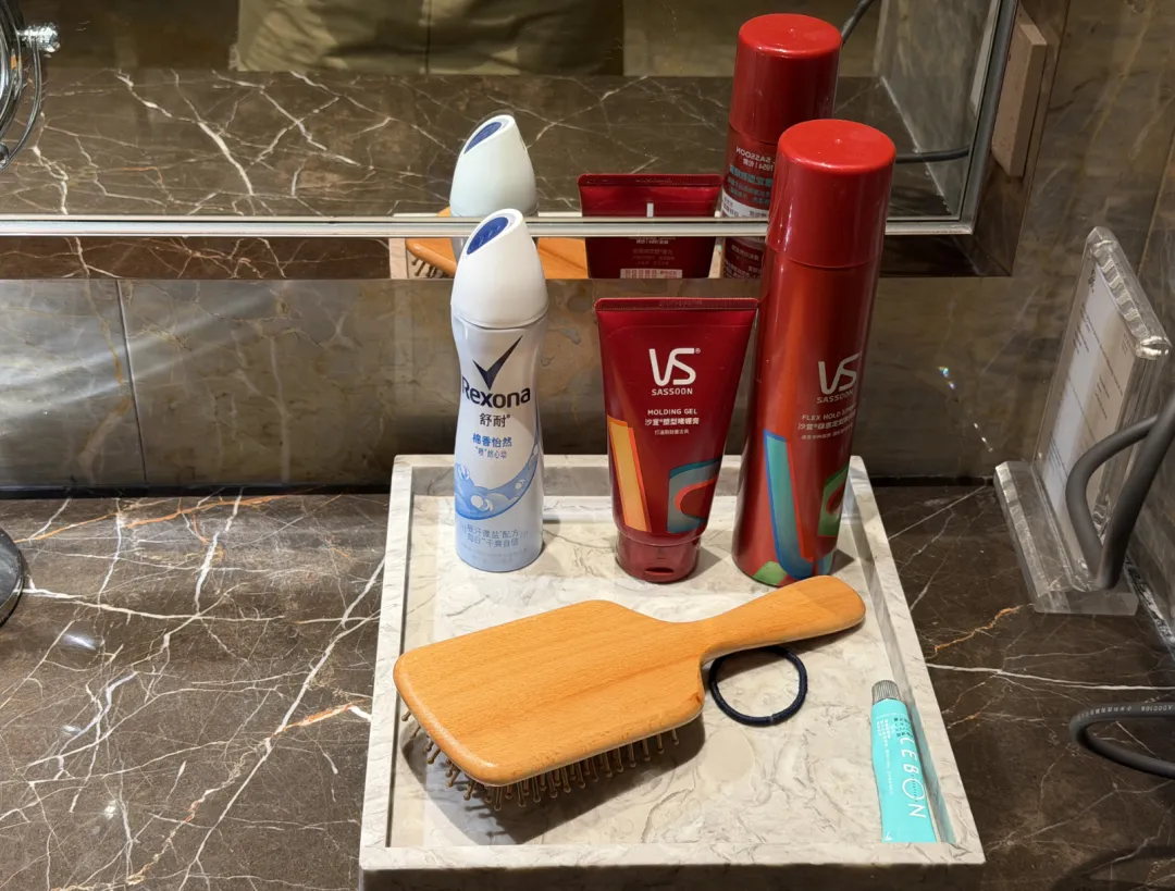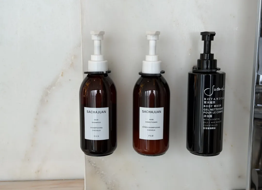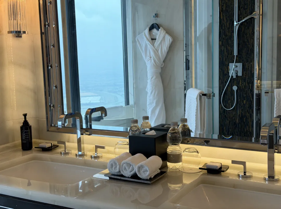 房间还是瑞吉一贯的风格,稳重、厚实。地毯厚,卫生间全大理石,质感在线。灯控是老式的,但用着顺手。主卫双台盆,靠窗有个梳妆台,淋浴和浴缸在一起。浴缸视野不错,能看到远处的山,备品还是Sachajuan。
