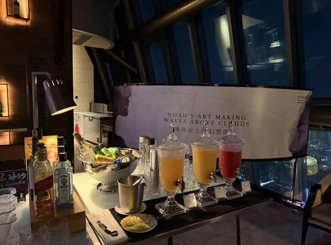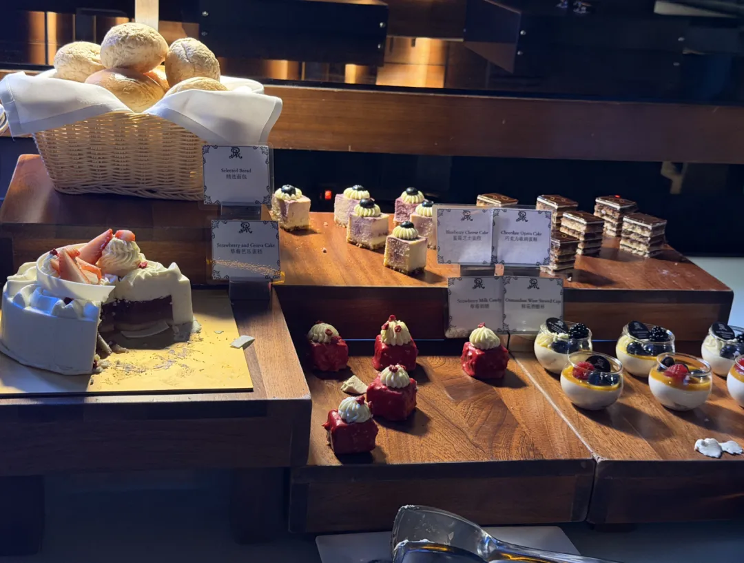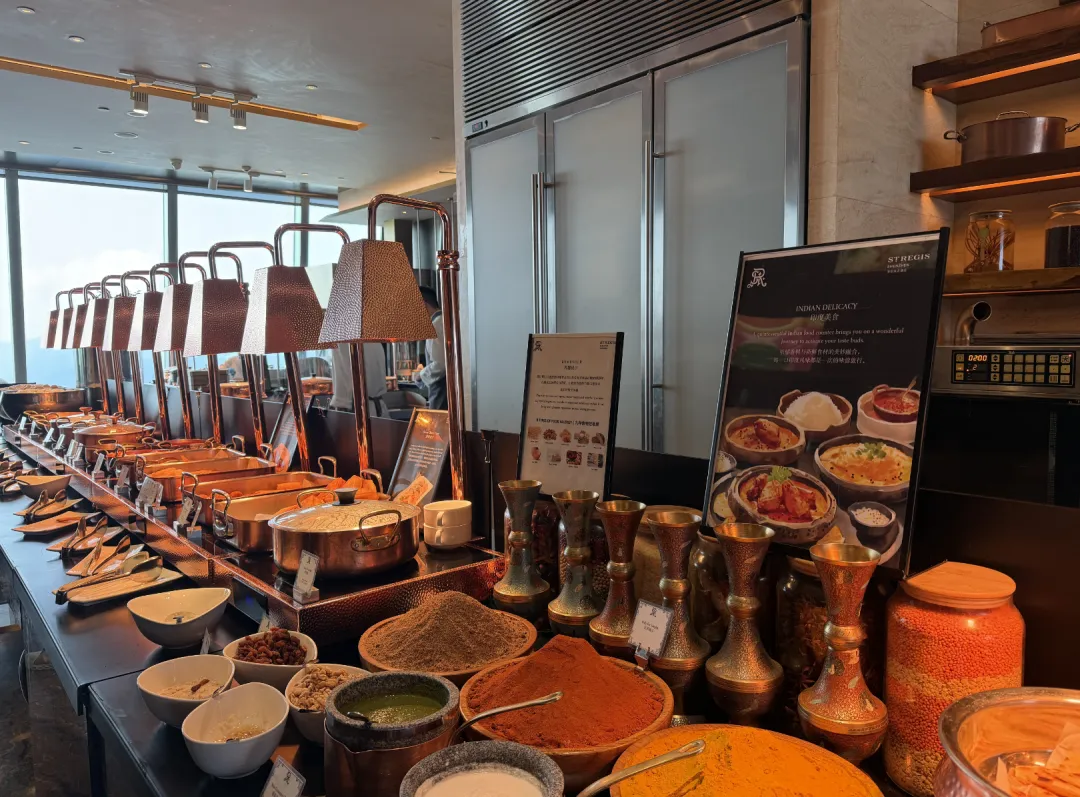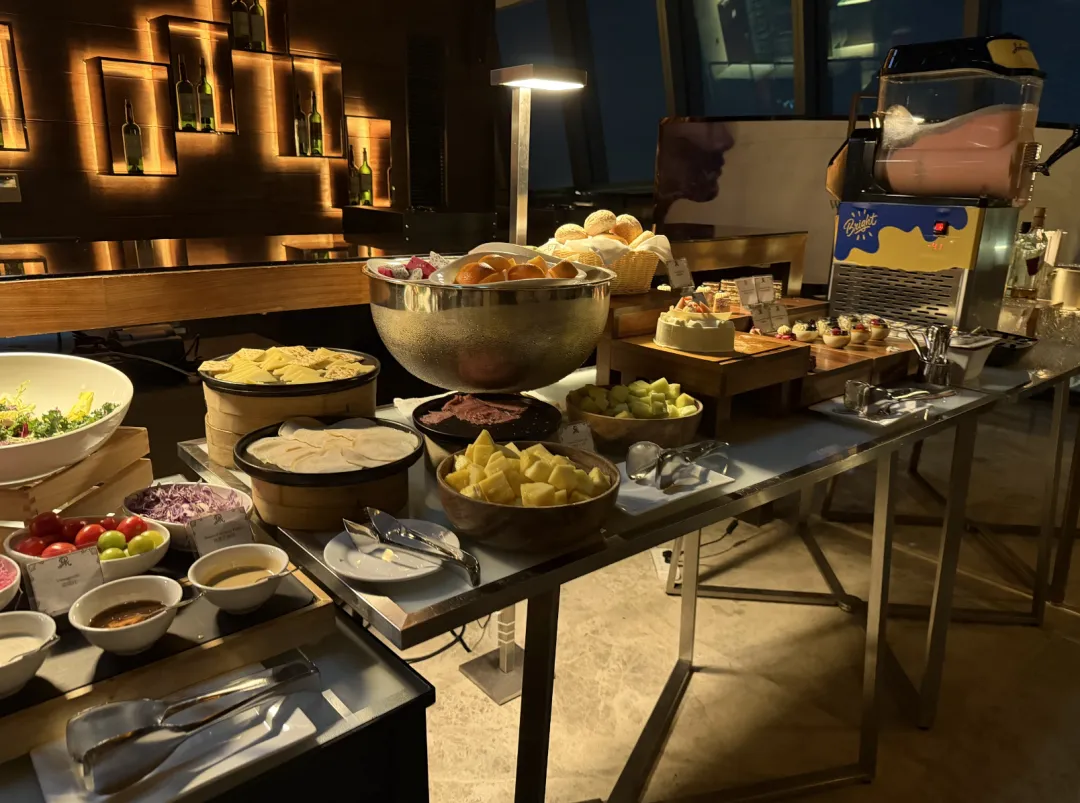 瑞吉本身不设行政酒廊,但国内几家会为会员提供傍晚的欢乐时光。这家也是,HH放在100层的瑞吉吧。菜品不多,管饱,出品还行,小蛋糕好吃。吧台的桌椅不太适合正经吃饭,但430米的高度摆在这——平时来这种高度的餐厅酒吧,消费可不低。