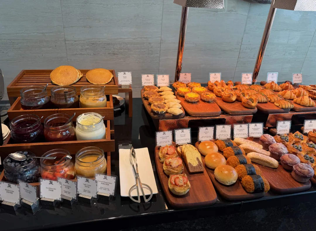 粥档是广东酒店的常规操作,鱼片粥料足、够新鲜、熬得绵软,调味也正。烘焙档精致,种类多,卖相和口感都不错。