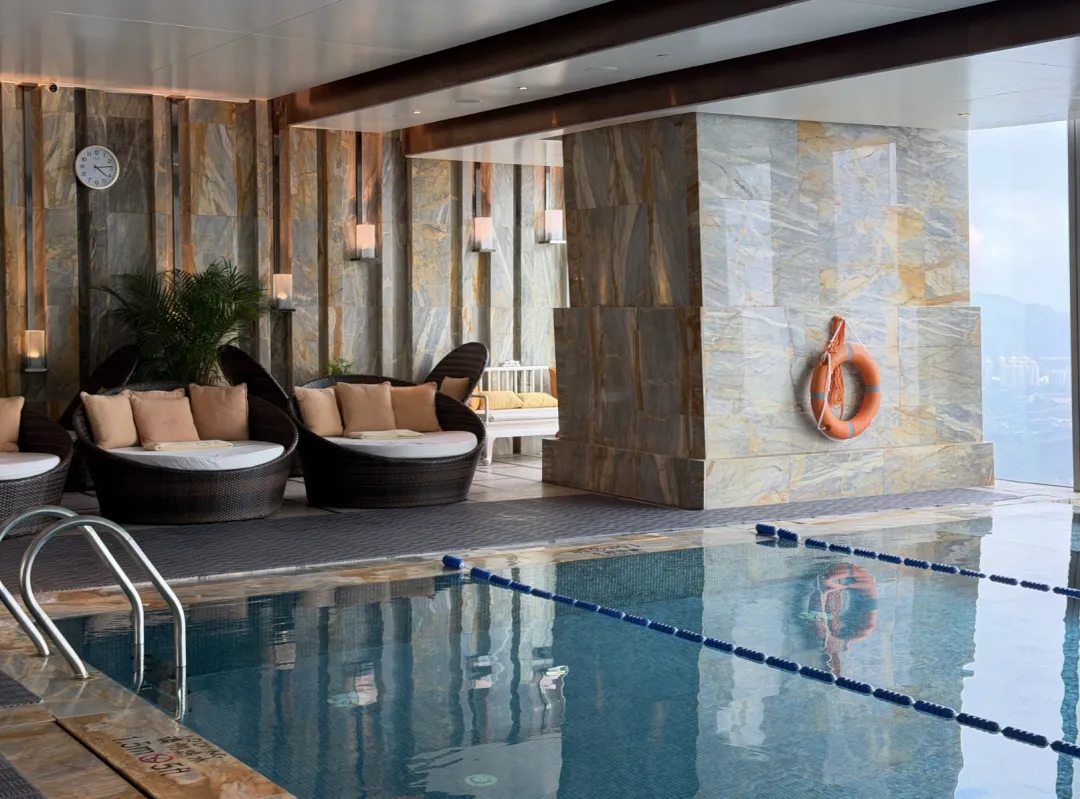 健身中心位于酒店75层,28米天际无边泳池由落地玻璃窗包围,令整座泳池如同镶嵌在云端,远处是香港葱绿的边界山景和落日夕阳,出片又悠闲。