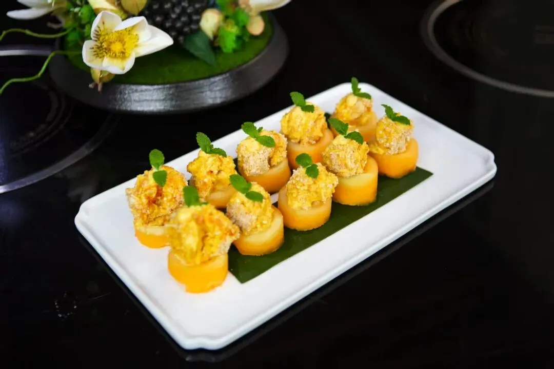 必点海胆菜品:海胆酱烧黑毛节瓜、橙香海胆