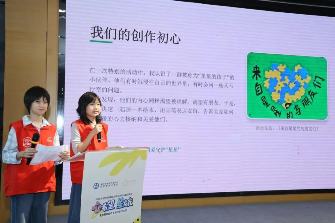 《来自星星的鸟朋友们》绘本分享环节,深圳市龙岗区莲花小学小作者邹芯湉、陈丽萍(化名)分享绘本创作初心时,一段话深深触动了在场每一位听众:刚认识星星孩子的时候,我们也曾对他们天马行空的问题感到困惑,直到走近才发现,那些“奇怪”的问题不过是他们看待世界独有的方式——他们就像来自不同星座的小鸟,只是歌声和飞翔的姿势与我们不同。她们说“友谊就像一幅拼图,每个人都是独特的一块,缺一不可”,直白的话语恰恰道出了同伴支持最本真的模样。当星星孩子被邀请共同玩耍、携手创作,当他们的独特表达被同伴看见并尊重,那份“我和大家一样”的认同感,会推着他们慢慢走出封闭的小世界,逐渐释放天性、勇敢展现热爱,慢慢绽放属于自己的光芒。