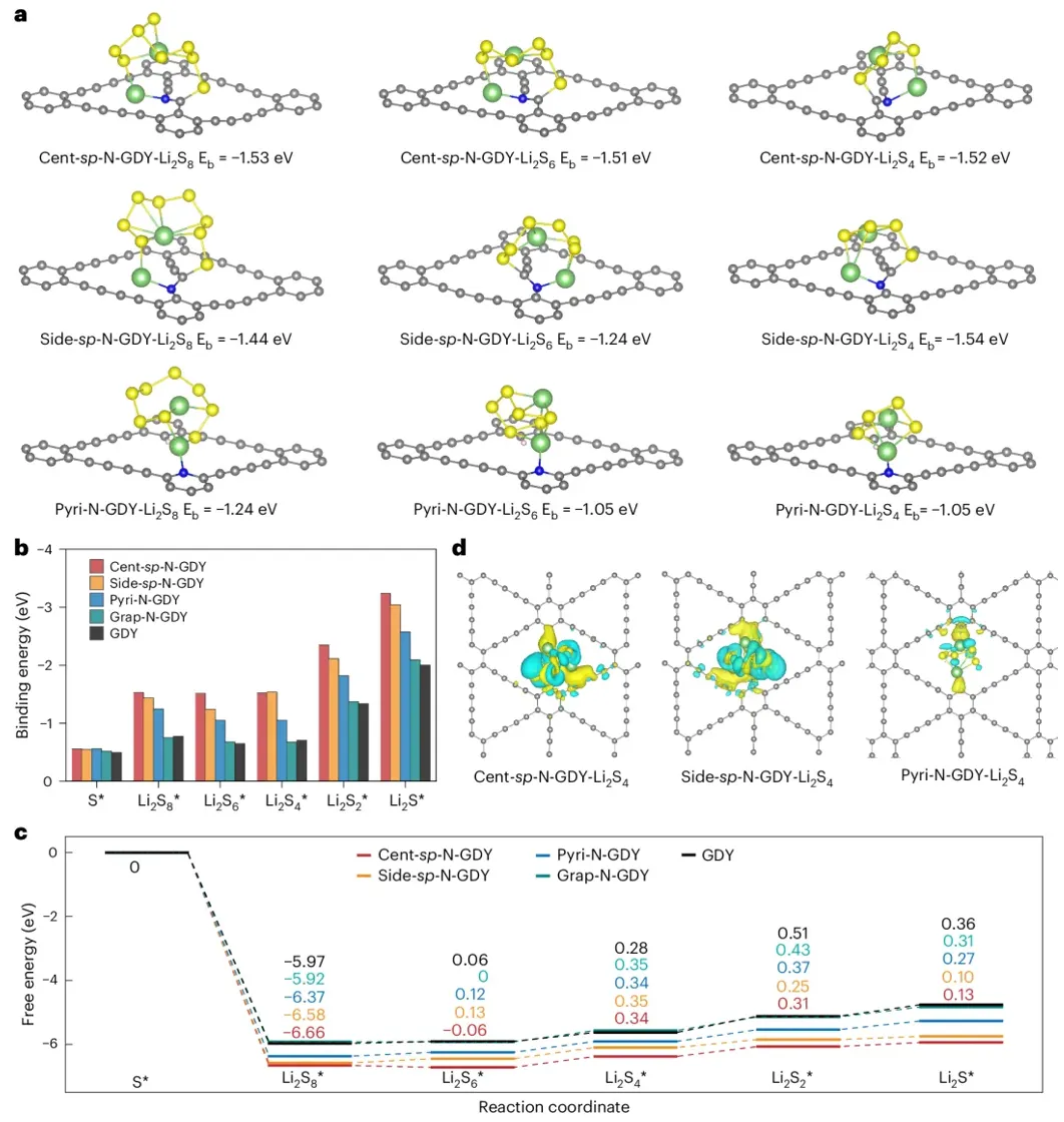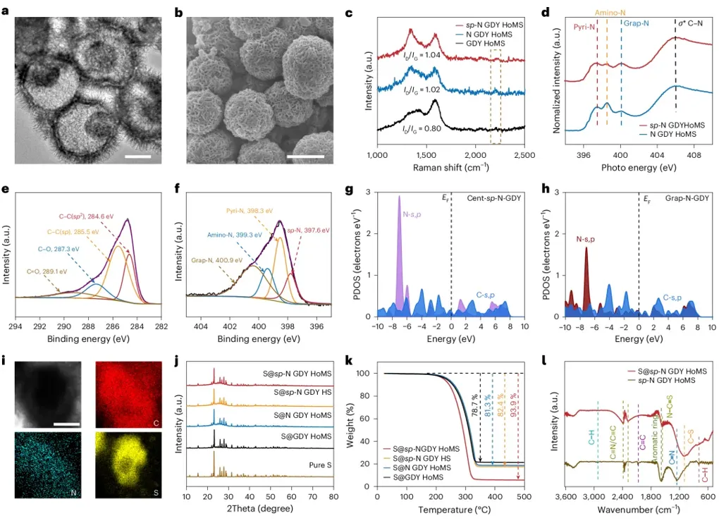 TEM和SEM结果表明,sp-N GDY HoMS由纳米薄片组装而成,具有清晰的中空多壳层形貌和垂直层状壁结构;这一结构为高硫负载、体积变化缓冲和多级空间限域提供了物理基础。Raman、XANES和XPS结果进一步表明,材料中成功引入了sp-N位点,且sp-N在总氮中占比约为17%。理论计算显示,Cent-sp-N位点的s,p轨道与石墨炔骨架之间具有更优的轨道重叠,可显著促进电子转移与电荷重分布。与此同时,硫在中空多壳层内部均匀分布,且与载体之间存在较强相互作用。该图所体现的关键点在于:本工作并非简单构筑了一个载硫中空骨架,而是通过“中空结构限域 + sp-N电子调控”的协同设计,建立了一个兼具结构承载与反应调控能力的高效平台。