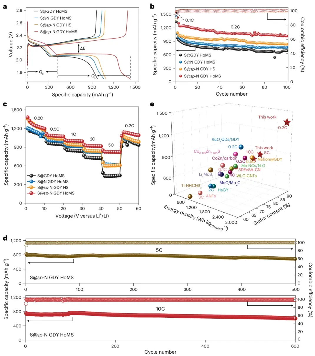 这项工作所解决的核心问题是:稳定性提升不再以牺牲实际能量密度为代价。在0.2C条件下,sp-N GDY HoMS电极表现出更低的极化和更高的放电平台,显示出更快的硫氧化还原动力学;在0.2C循环100圈后,容量仍保持1014.2 mAh g-1。倍率测试中,该体系在0.2C、0.5C、1C、2C和 5C下分别实现1380.7、1115.0、1014.8、941.8和850.6 mAh g-1,当倍率恢复至0.2C后,容量可回升至1140.0 mAh g-1。更重要的是,在更严格的“硫+HoMS总质量”统计下,该体系仍实现1462 mAh g-1的近理论容量,并在10C条件下维持1384.5 Wh kg-1的能量密度和600 圈稳定循环。这表明本工作真正突破的是锂硫电池长期存在的结构性矛盾:在不显著增加非活性质量的前提下,同时实现高比能输出与长循环寿命。