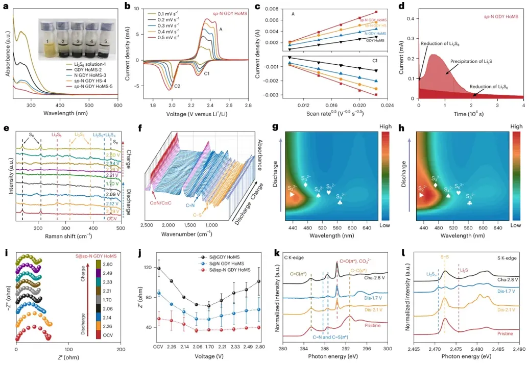 Li2S6吸附实验和紫外-可见吸收结果表明,sp-N GDY HoMS对多硫化物具有最强的吸附能力,能够更有效抑制穿梭效应;但其价值并不止于“吸附更强”。CV、扩散行为分析和Li2S沉积实验进一步表明,该体系具有更高的Li+扩散能力和更大的Li2S沉积容量,说明其能够显著促进液-固转化和后续反应动力学。原位Raman、原位FTIR、原位UV–vis和原位EIS则共同显示,在充放电全过程中,该体系具有更低的中间体浓度、更小的界面电荷转移阻力和更平稳的阻抗演化。也就是说,本工作解决的并不是“能否困住中间体”的局部问题,而是进一步实现了多硫化物从被锚定到被快速转化的连续协同,避免中间体在界面积累并演化为新的反应障碍。