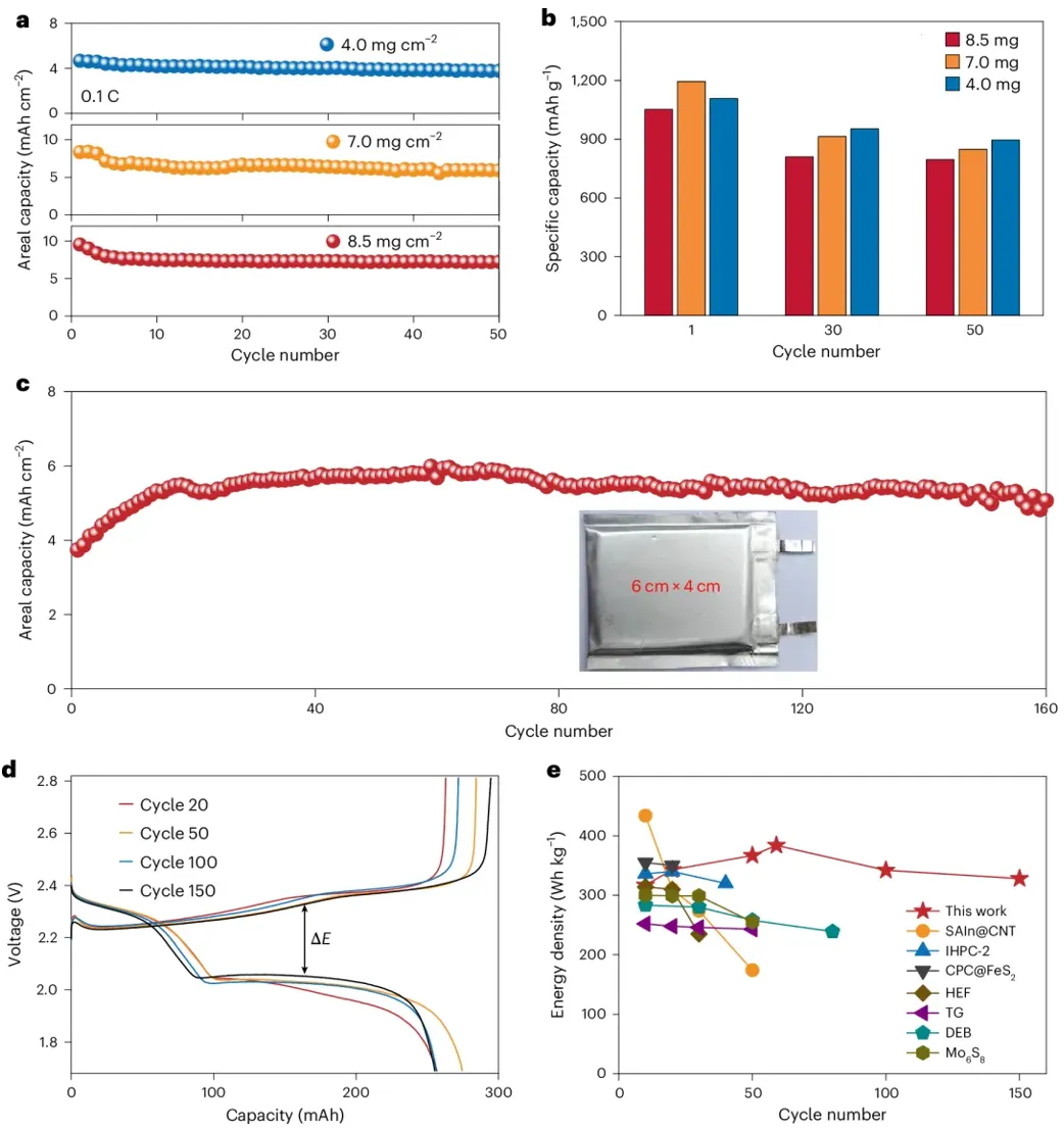 图2|锂硫电池的电化学性能:在高硫负载下同时实现高容量、优异倍率与长循环