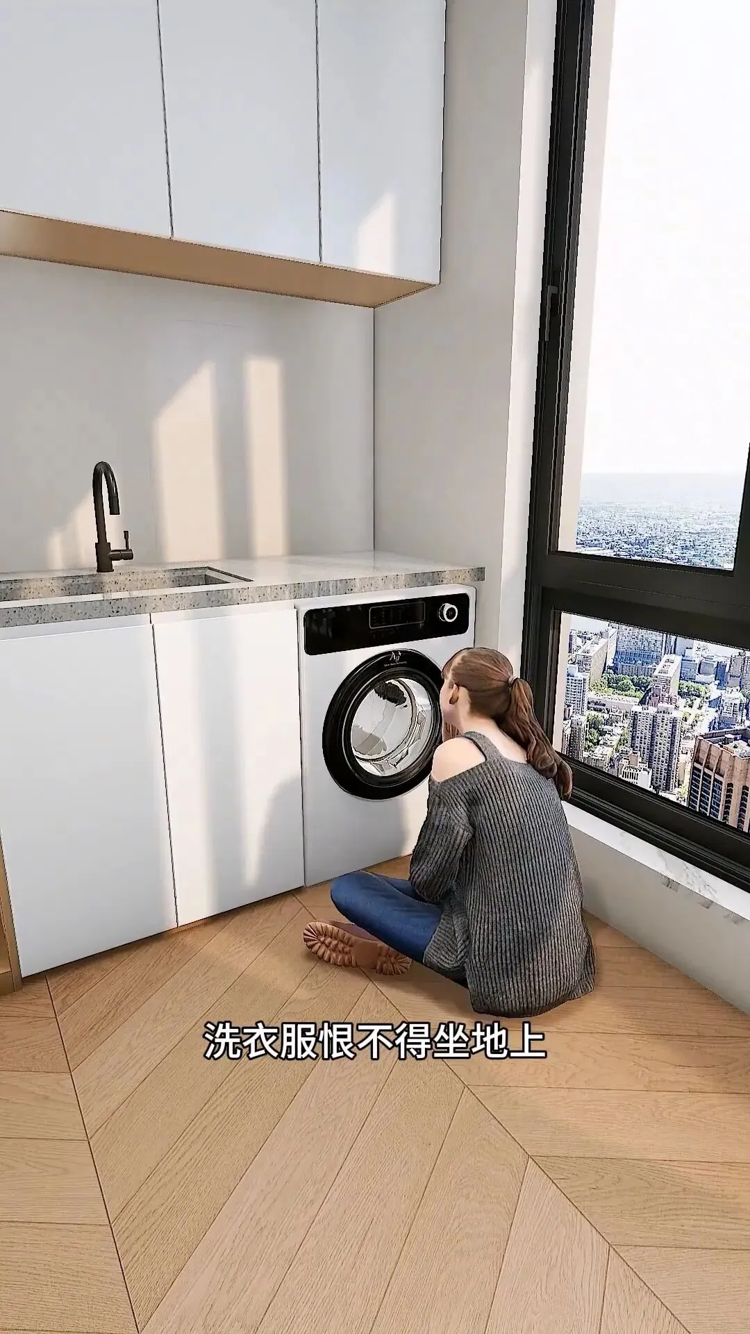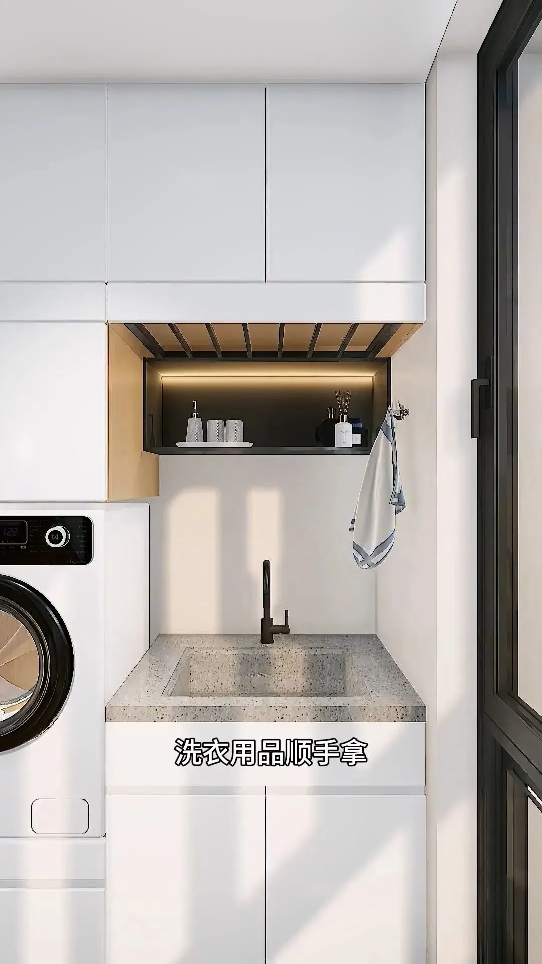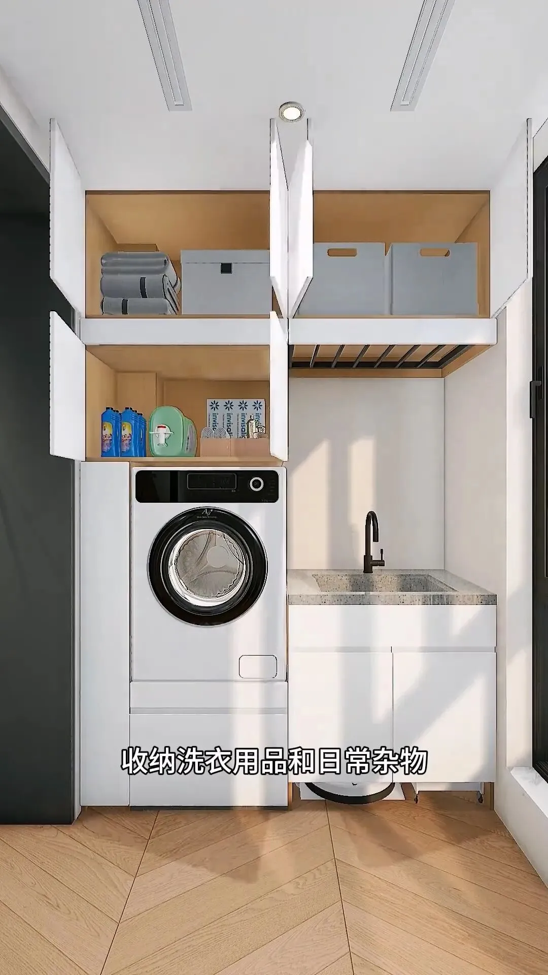 传统洗衣区大多都是上方收纳、下方洗衣,中间空间白白浪费,洗个衣服恨不得直接蹲在地上。