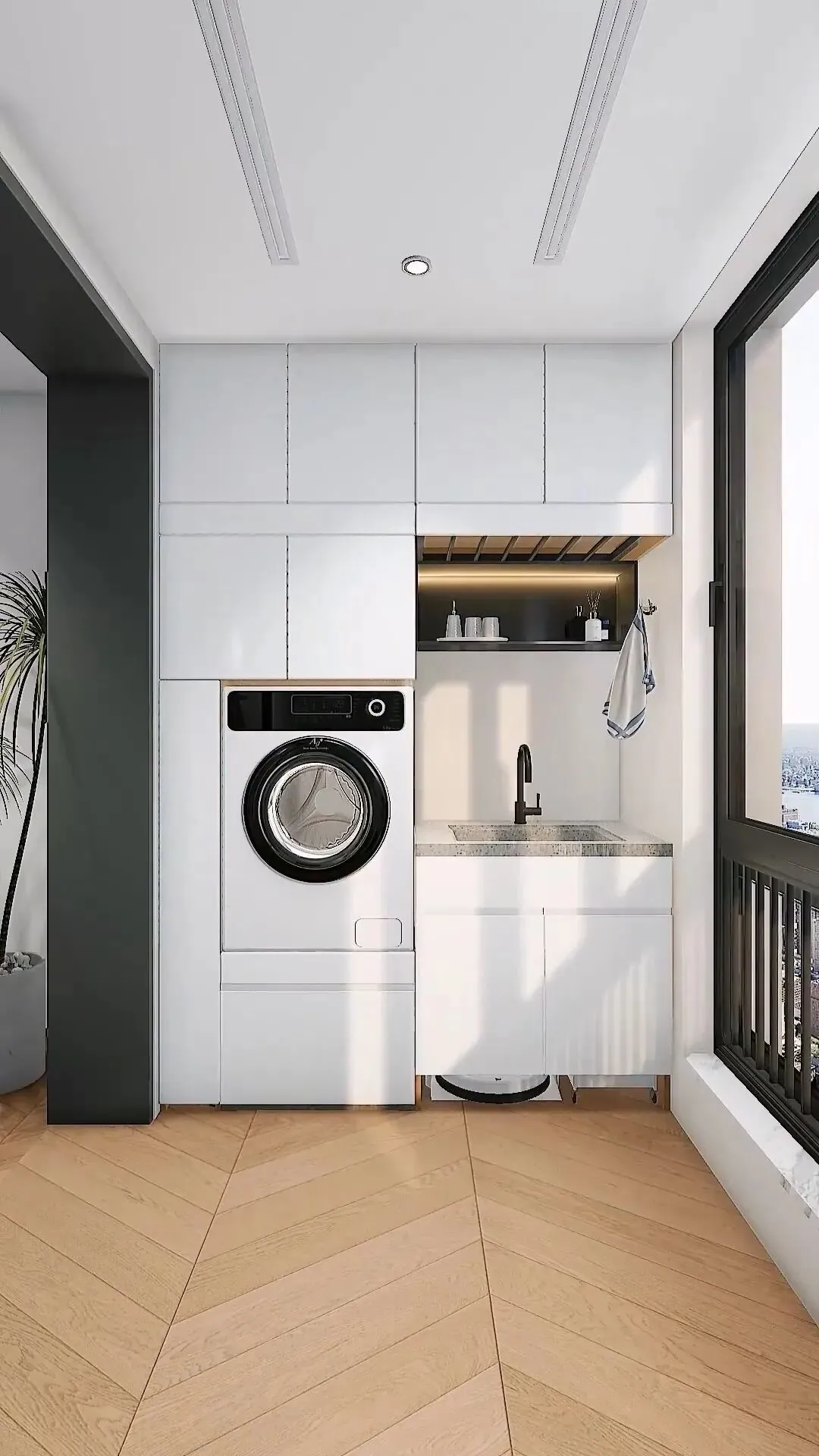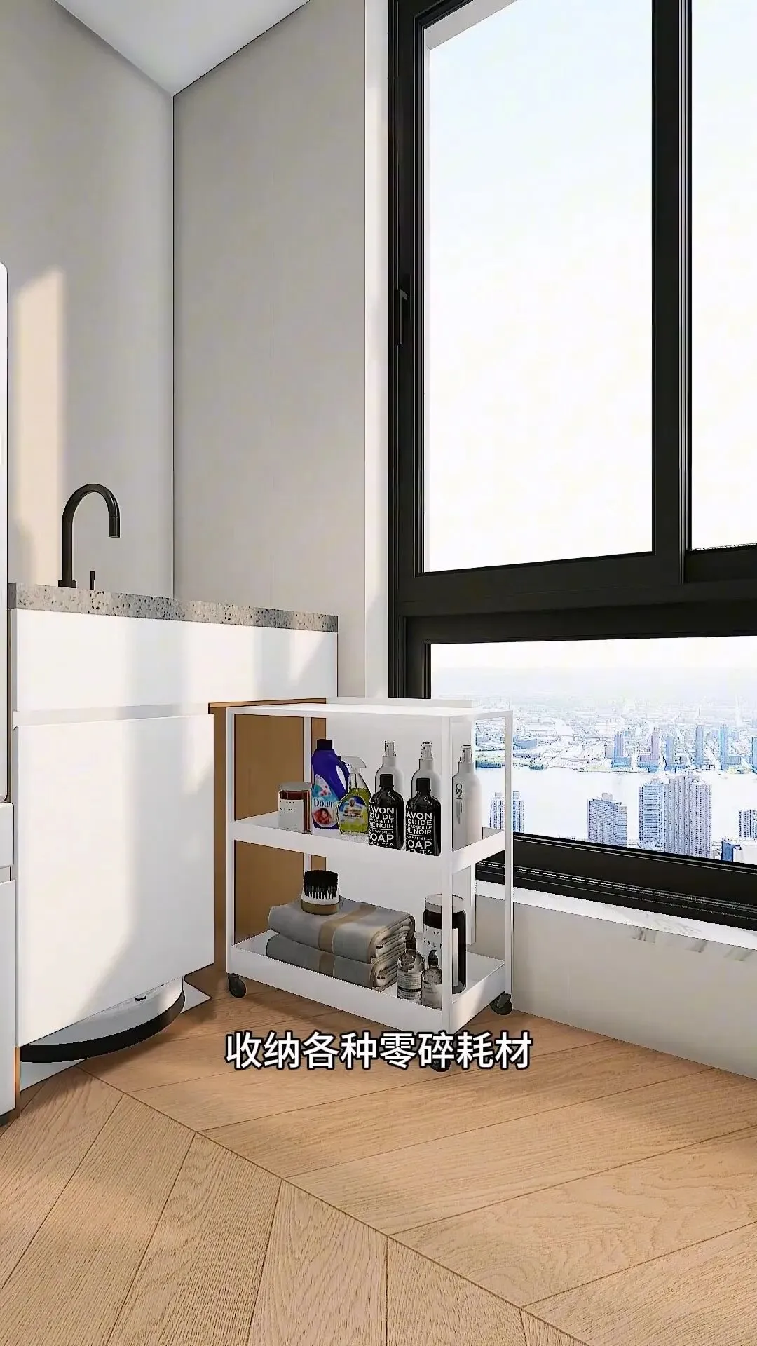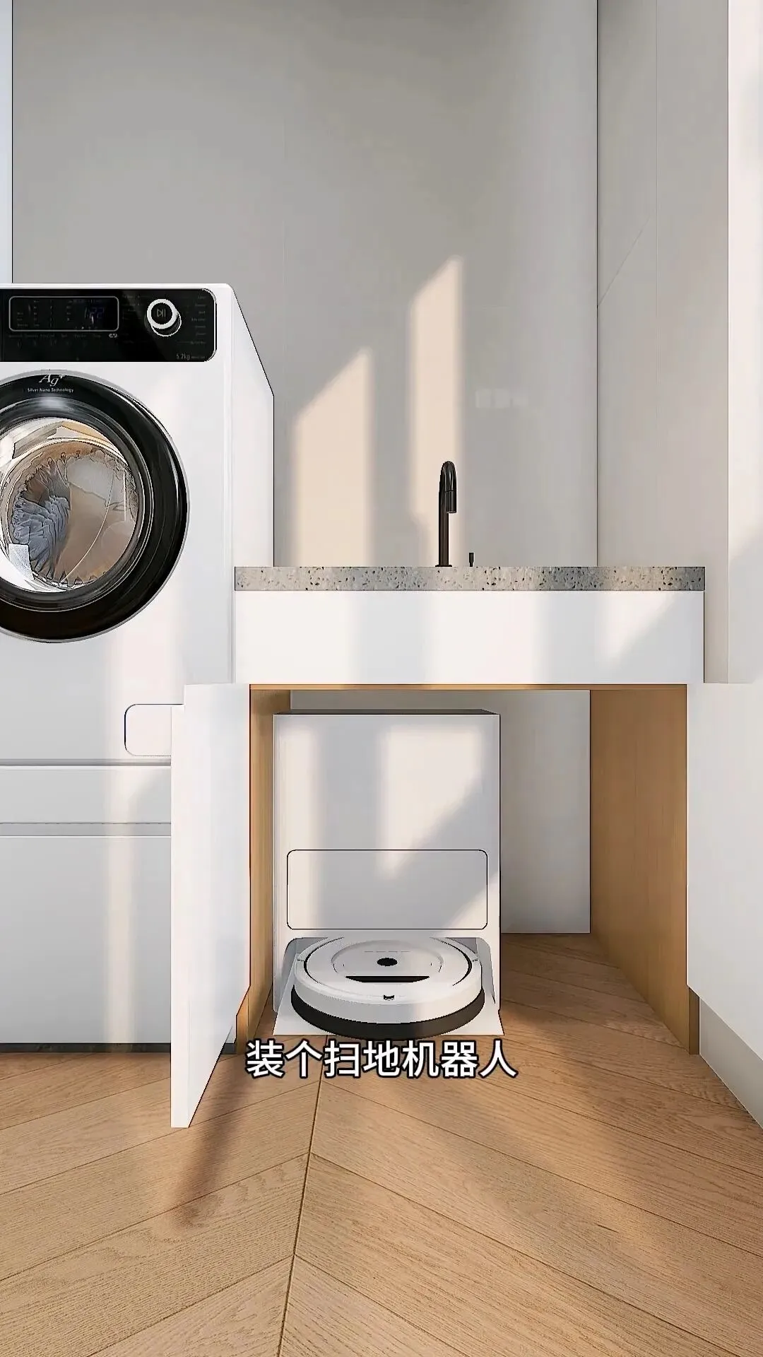 旁边定制一体洗衣池,直接安放扫地机器人,地面清洁省心又省力。另一侧摆上收纳小推车,各类清洁杂物都能整齐归置。
