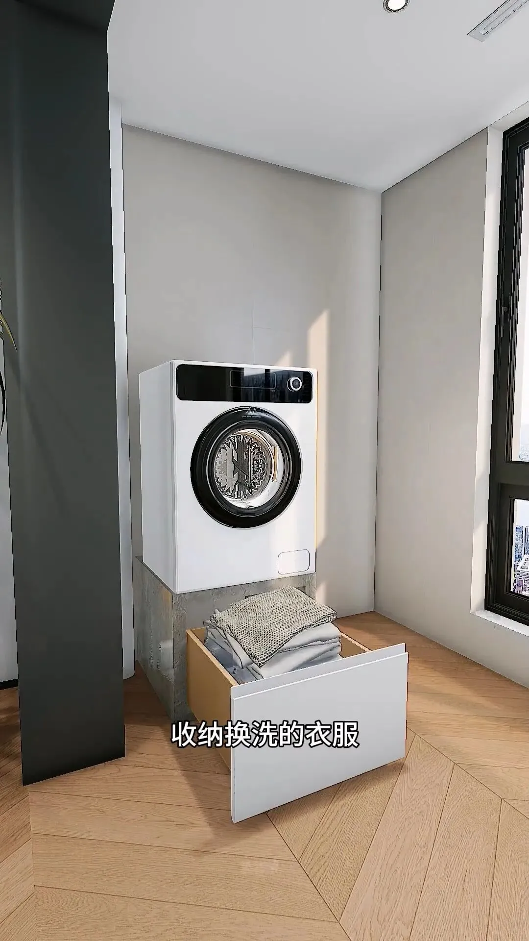 做结实又耐用的地台,把洗衣机整体抬高,再也不用费劲弯腰,洗衣服也能变成一种享受。底下做超大抽屉,专门收纳换洗衣物。