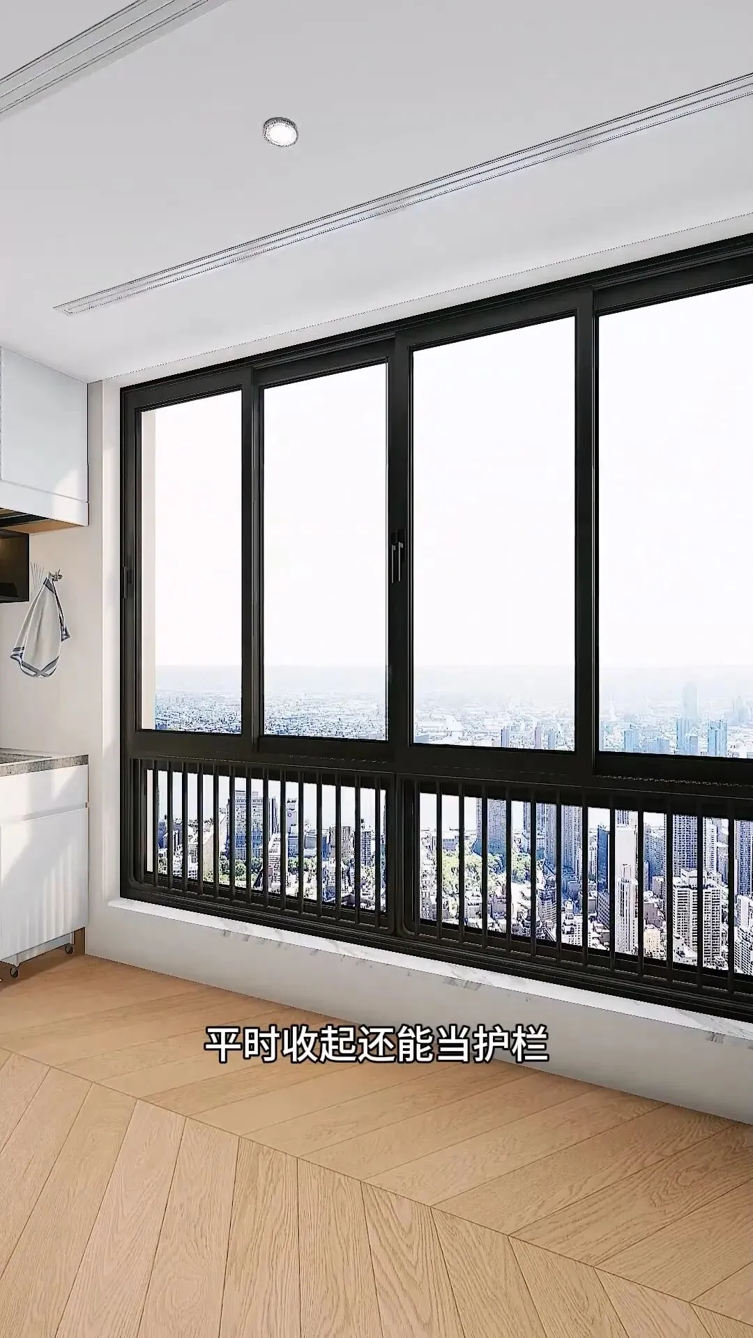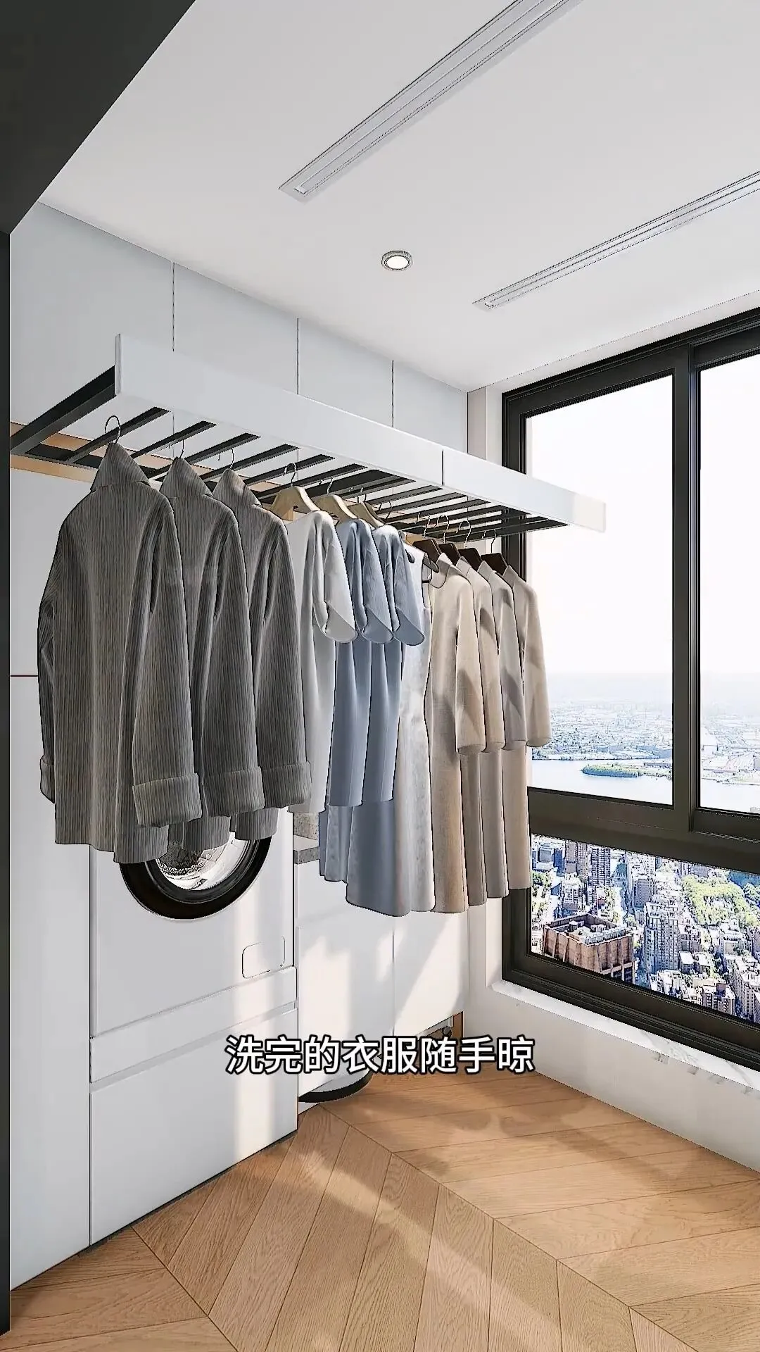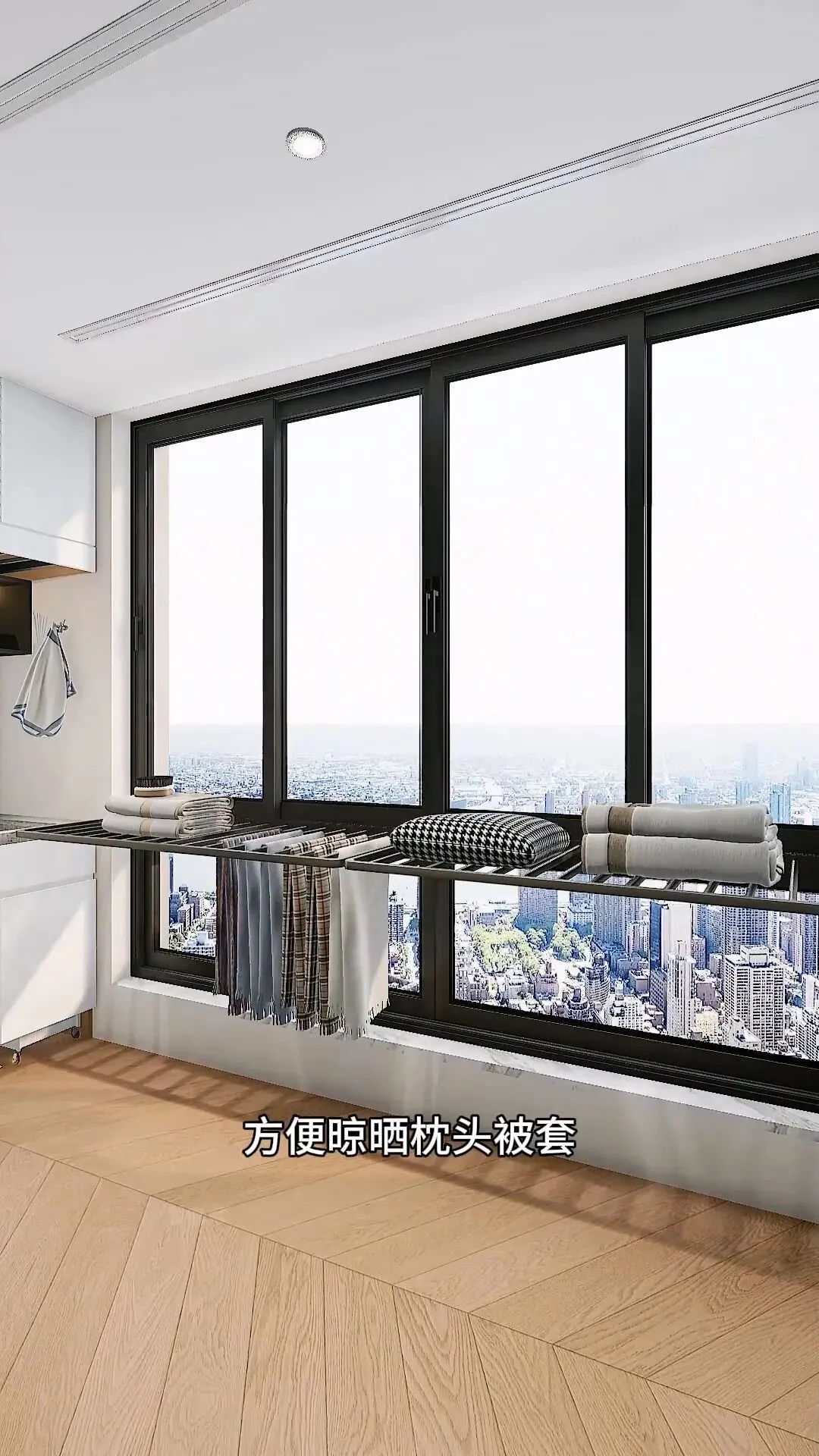 窗边安装折叠晾衣架,晾晒枕头、被套超合适,平时收起还能充当护栏,洗衣晾衣样样不将就。